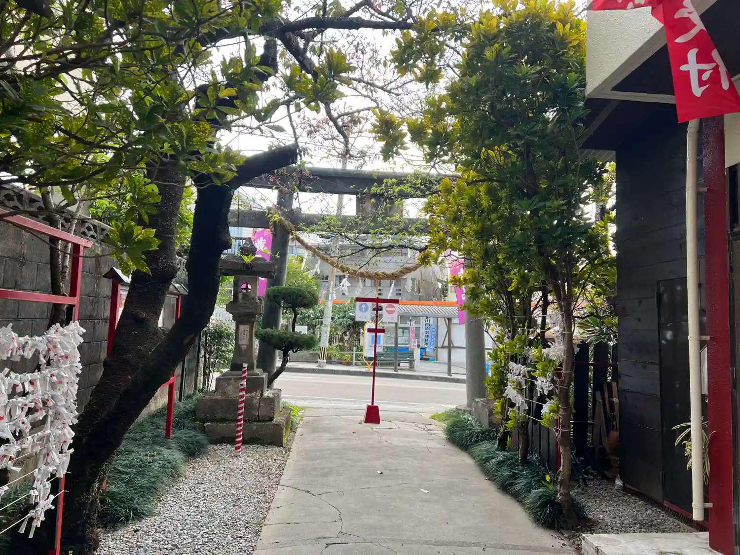 境内南端入口全景。住宅街の中の交通量の多い道に面している。