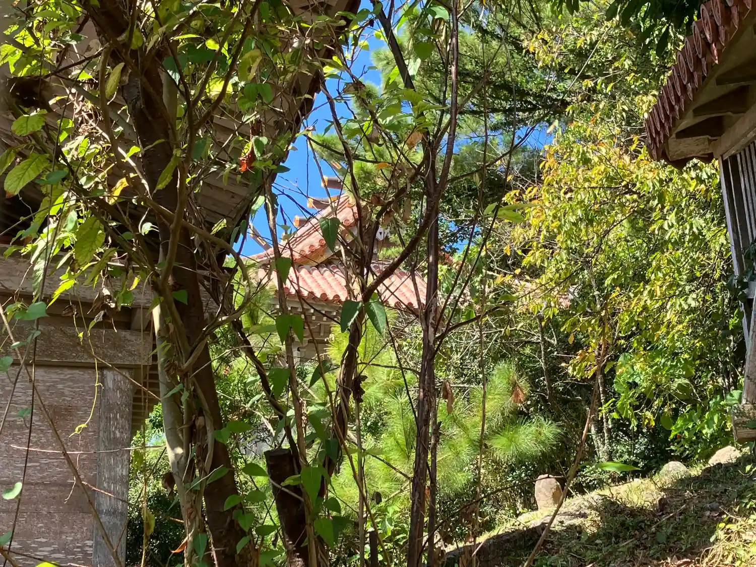 洞窟への通路から見える、拝殿後ろの<本殿>。かなり立派。