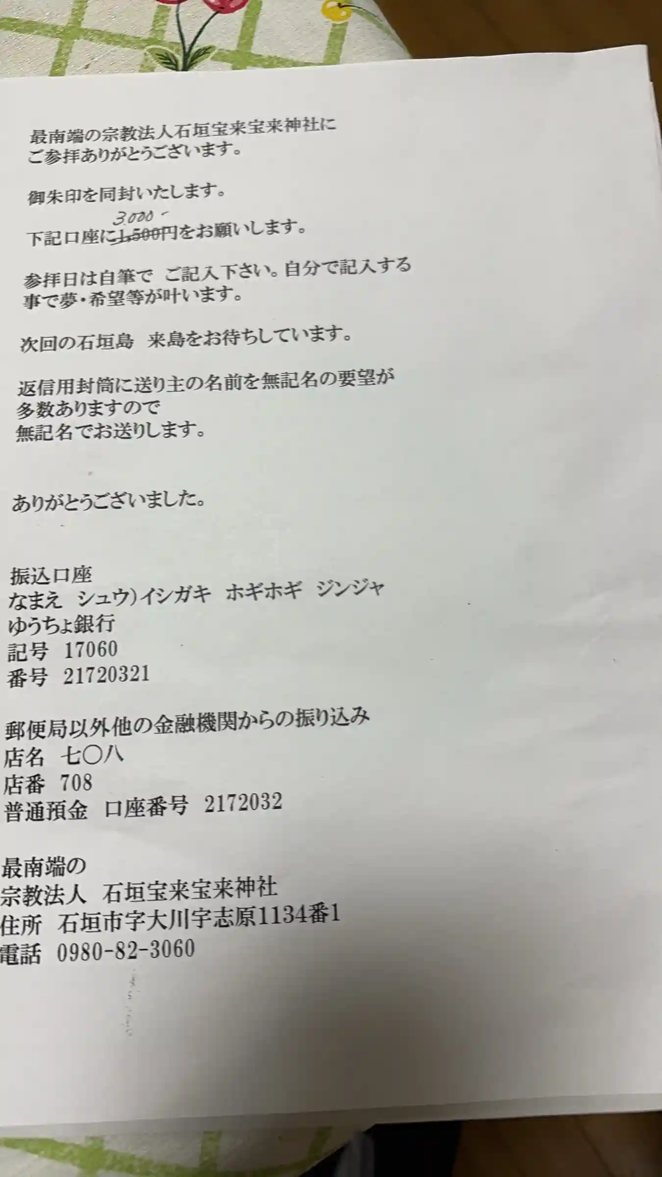 社務所は本殿の下あたりにありましたが基本無人の為、拝殿にある封筒に住所を書いておくと御朱印は後日郵…