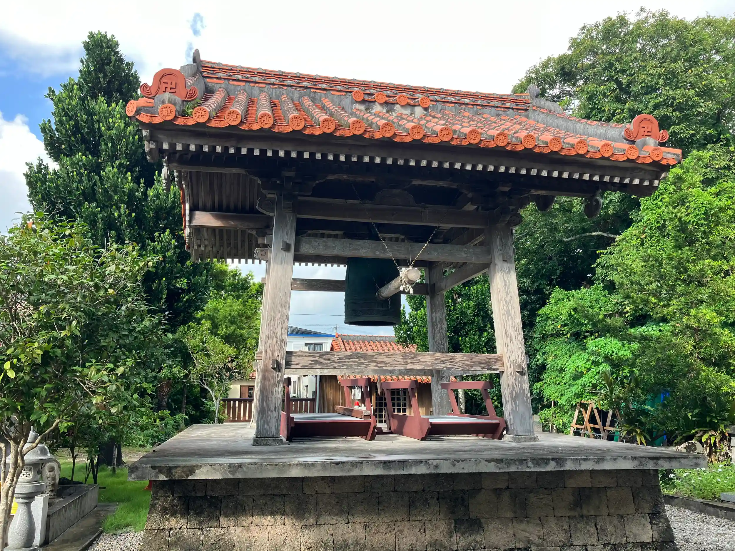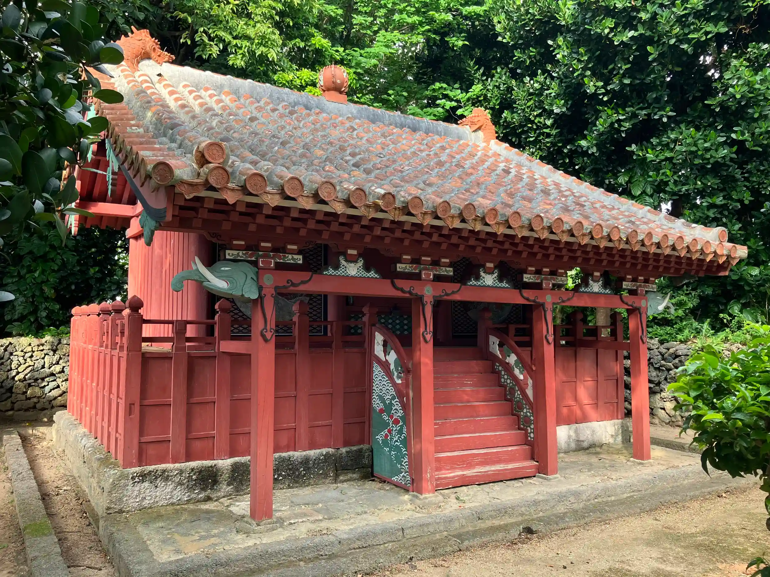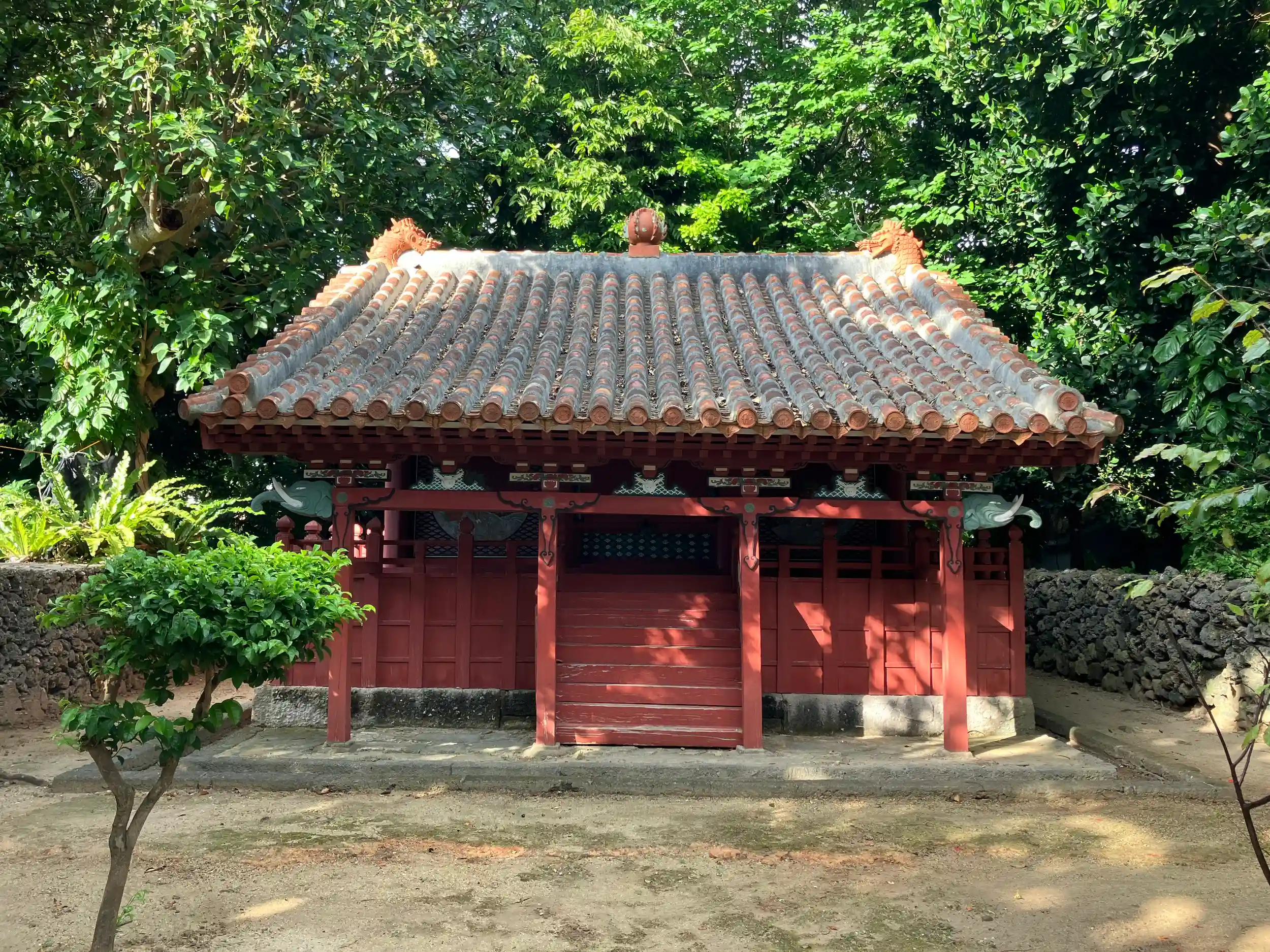 日本最南端の近世寺社建築の遺構とされ、神殿と拝殿が重文、表門及び周囲の石牆が附指定されている。