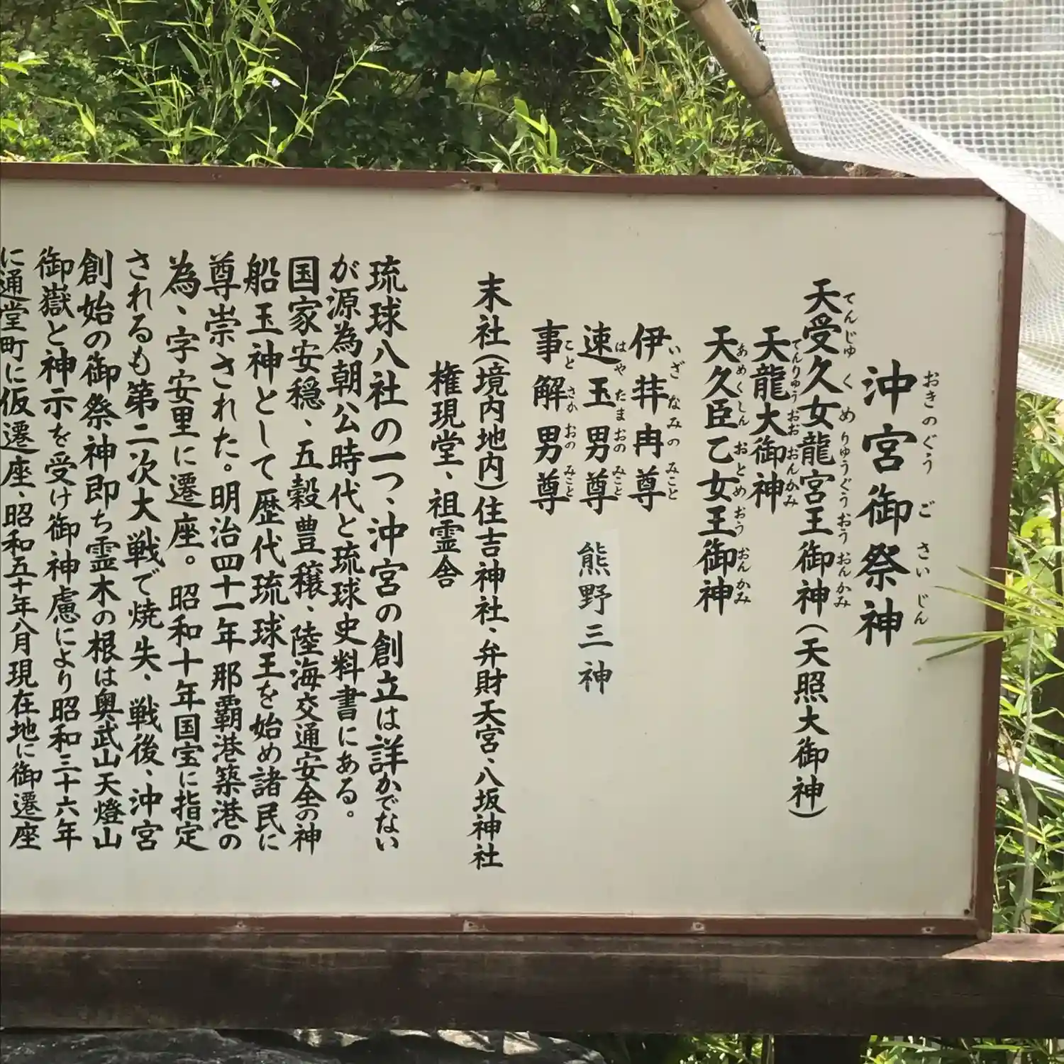 | ご由緒 | 琉球八社の一つ・沖宮の創建は詳かでないが源為朝公時代と琉球史料書にある。 国家安穏・五穀豊穣・陸海交通安全の神船玉神として歴代琉球王を始め諸民に尊崇された。明治41年那覇港築港の為・字安里に遷座。昭和10年国宝に指定されるも第二次大戦で焼失・戦後・沖宮創始の御祭神、即ち霊木の根は奥武山天燈山御嶽と神示を受け御神慮により昭和36年に通堂町に仮遷座。昭和50年8月現在地に御遷座。 |