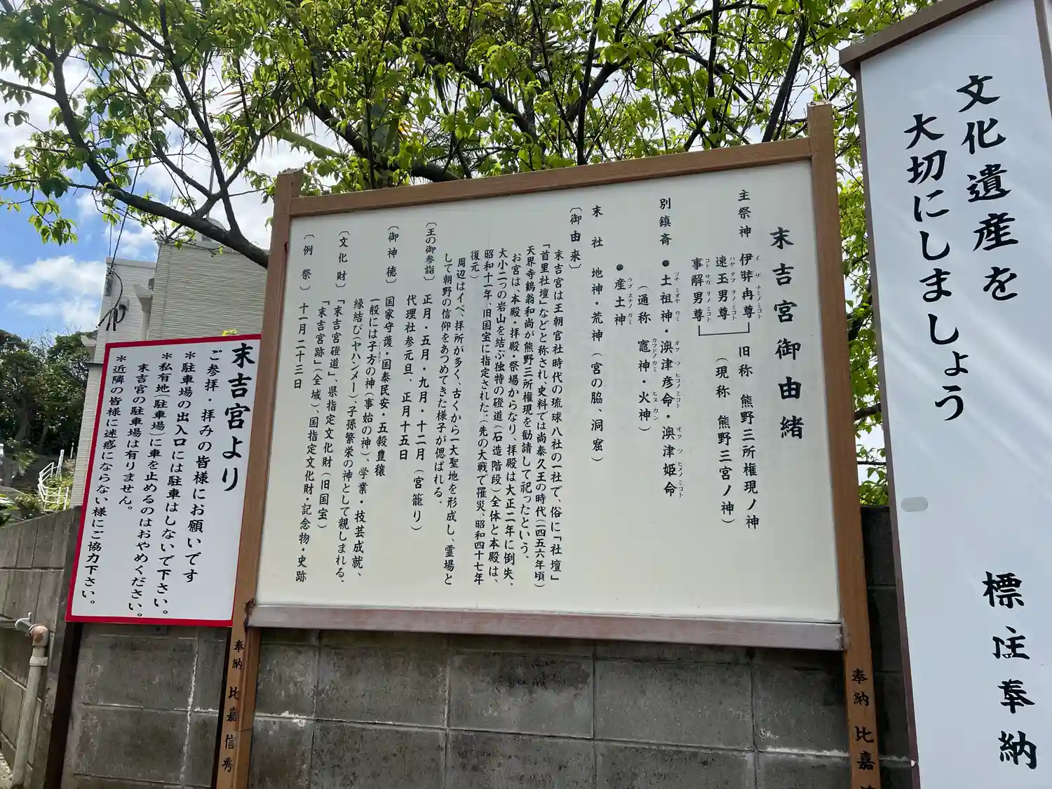 王朝官社時代の琉球八社の一社で、俗に「社壇」「首里社壇」などと呼ばれ、史料には尚泰久王の時代(1456年頃)に天界寺鶴翁和尚 (かくおうおしょう)が熊野三所権現を勧請し祀ったと伝えられています。