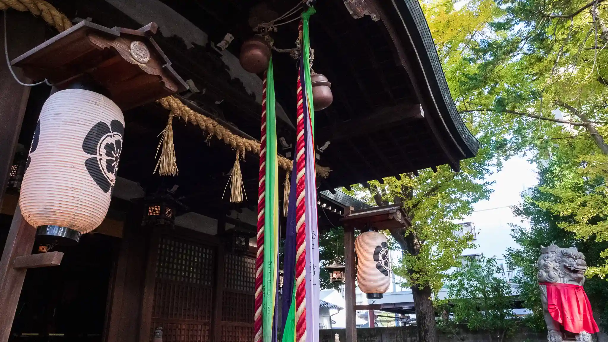 商店街の途中という少し変わった立地ですが、背の高い立派な木がたくさんあって鳥の鳴き声もする、すぐ隣が商店街とは思えない自然いっぱいの境内でした。