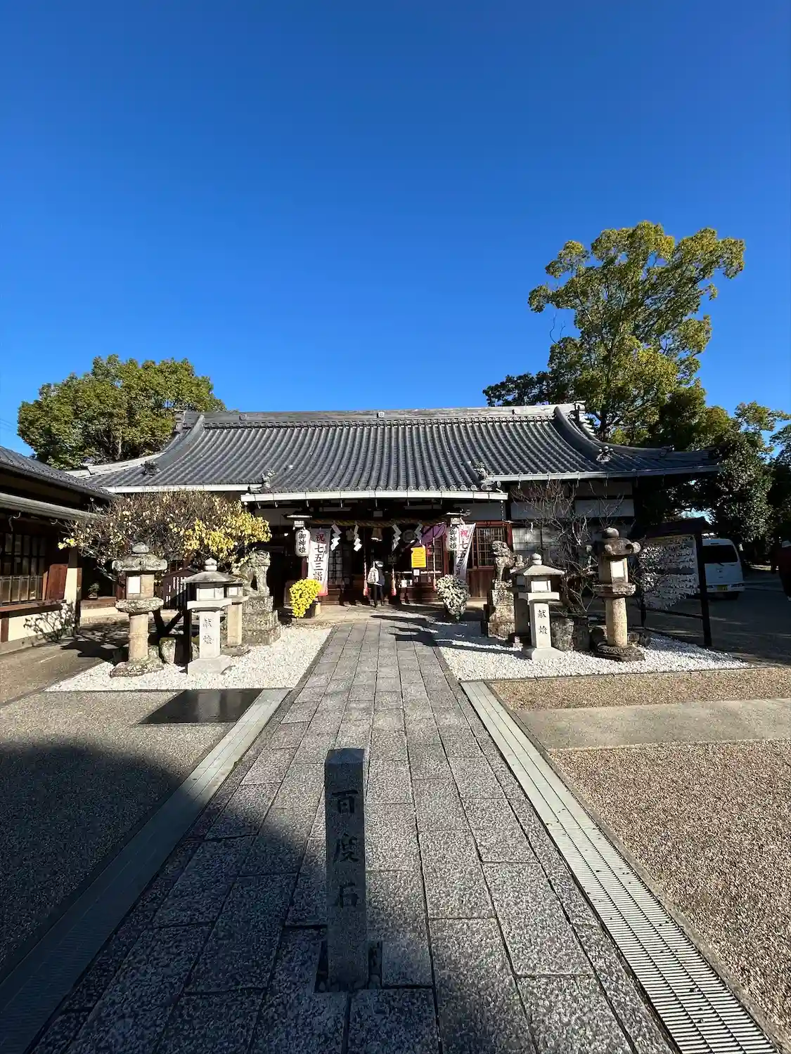 とっても細い道で、離合がなかなか難しい所にありました。七五三の着物を来た子供たちが沢山で賑わって居…