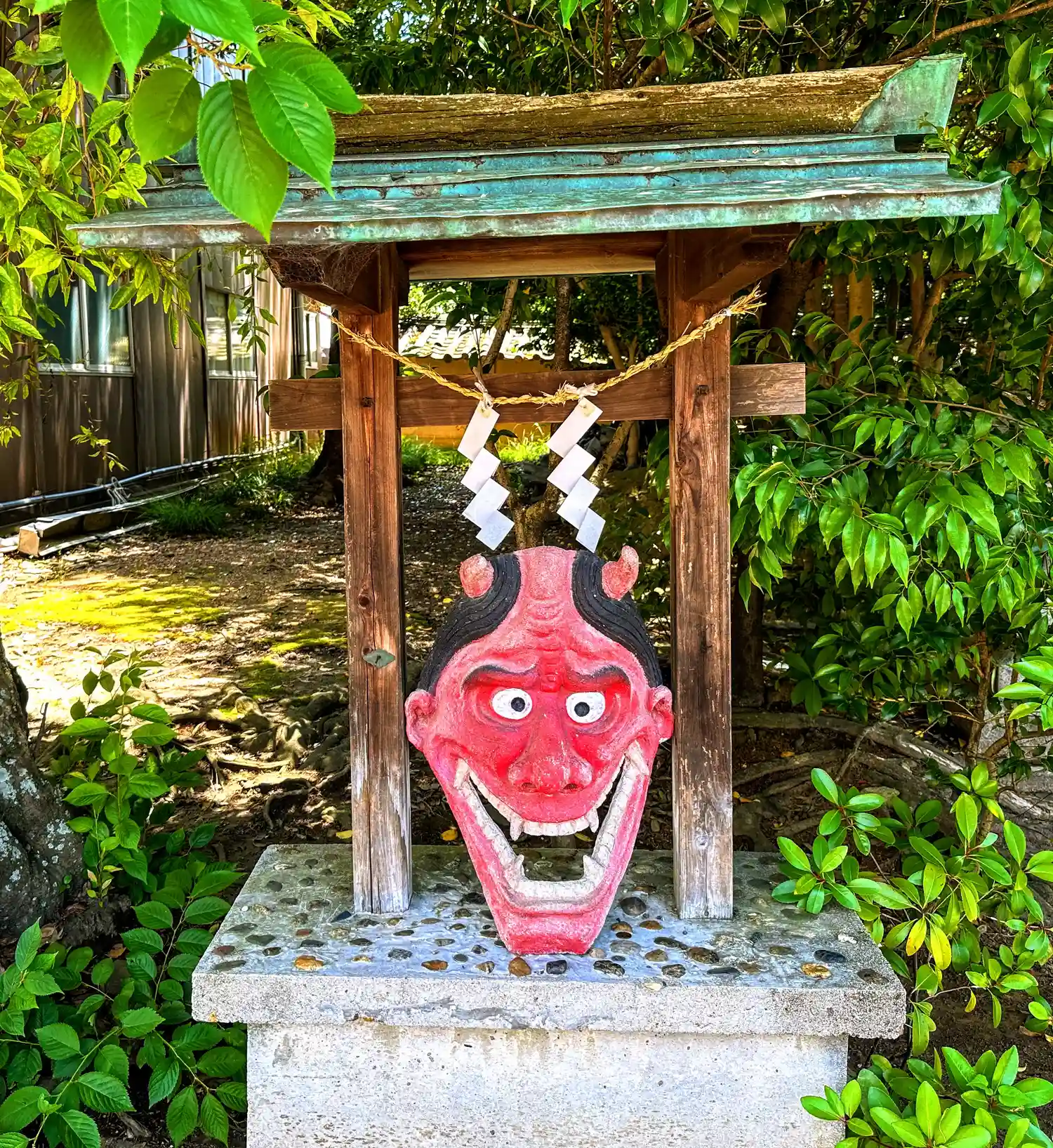 拝殿右手に鬼のお面