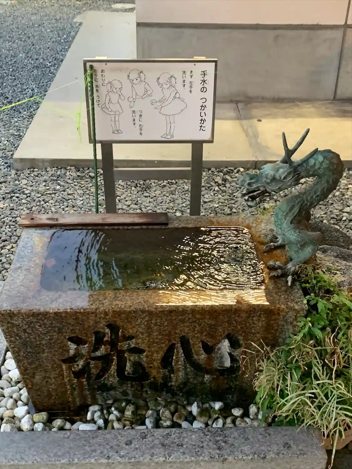 朝散歩の途中で参拝しました。手水場の受け手の竹がなくなっていました。前回の参拝時、交換が近いとのことだったので、修理中のようです。