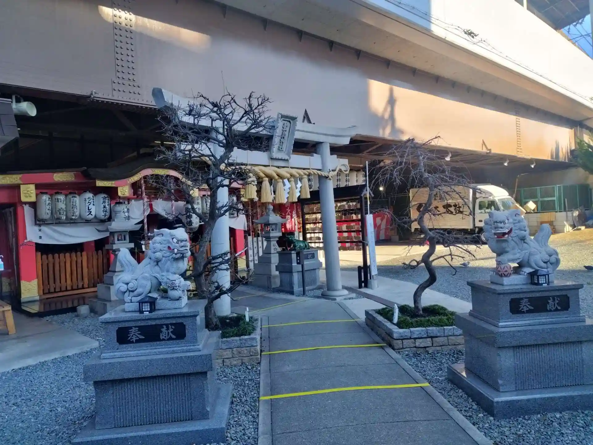 京阪電鉄萱島駅の高架下ある神社で神木の大楠が駅構内に入っています。