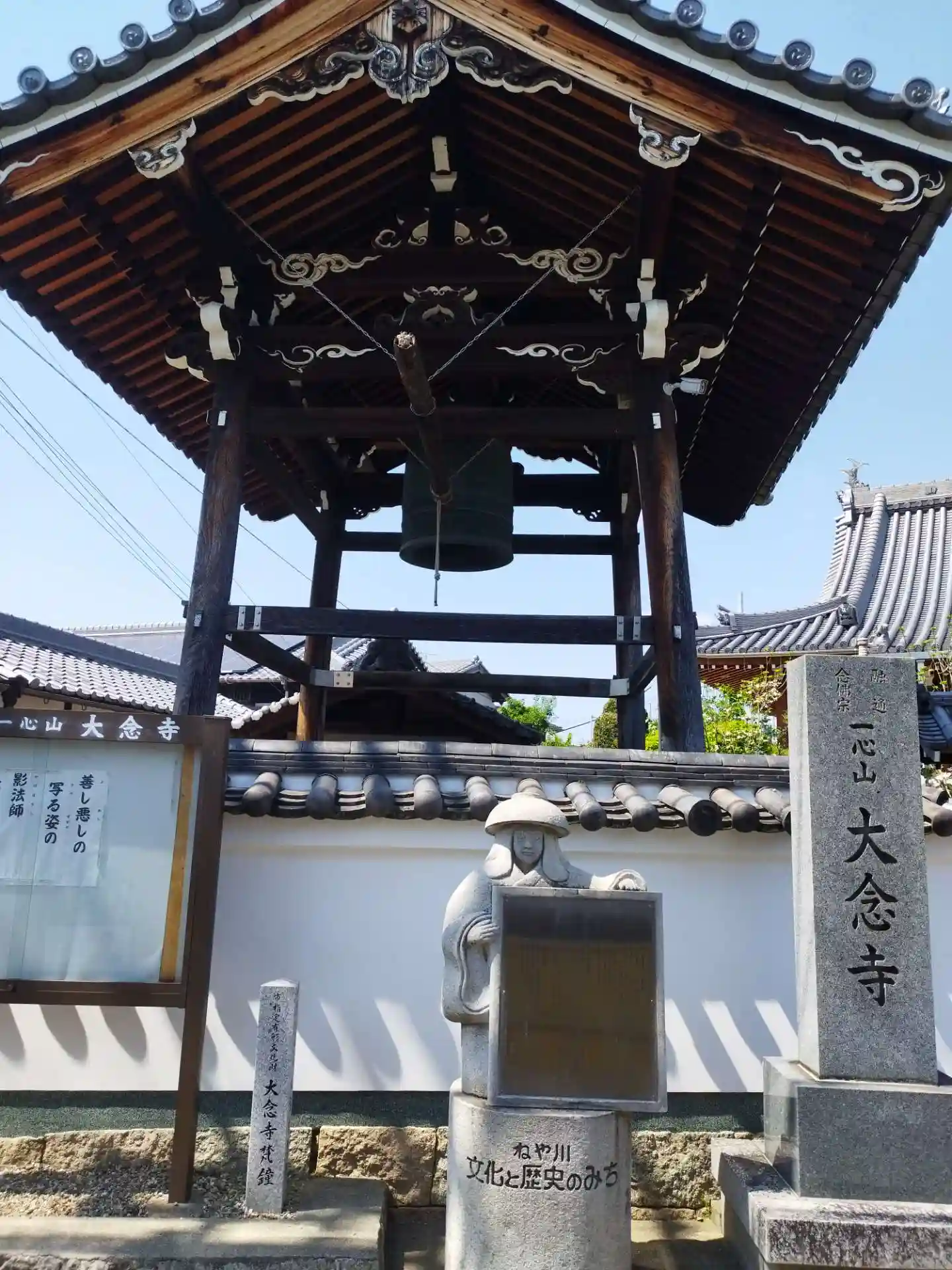 心に響くありがたい一句と 寝屋川市の街道沿いにあちこちで見かける鉢かつぎ姫の像。 立派な梵鐘は大晦日には近隣の方が鐘つきに並ばれるそうです^^ わたしも訪れたいと思いました☆