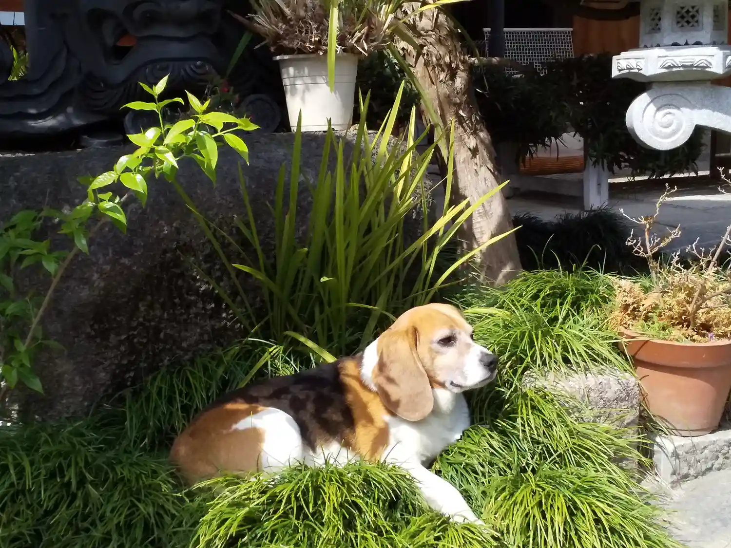 番犬のはるくん(ビーグルの男のコ) 中に入ってからは一切吠えることもなく、 お気に入りだという場所で寛いでました。 (草がヒンヤリ気持ちが良いのだとか^^) 背景の強面さんに劣らず、凛々しい顔立ちですね^^