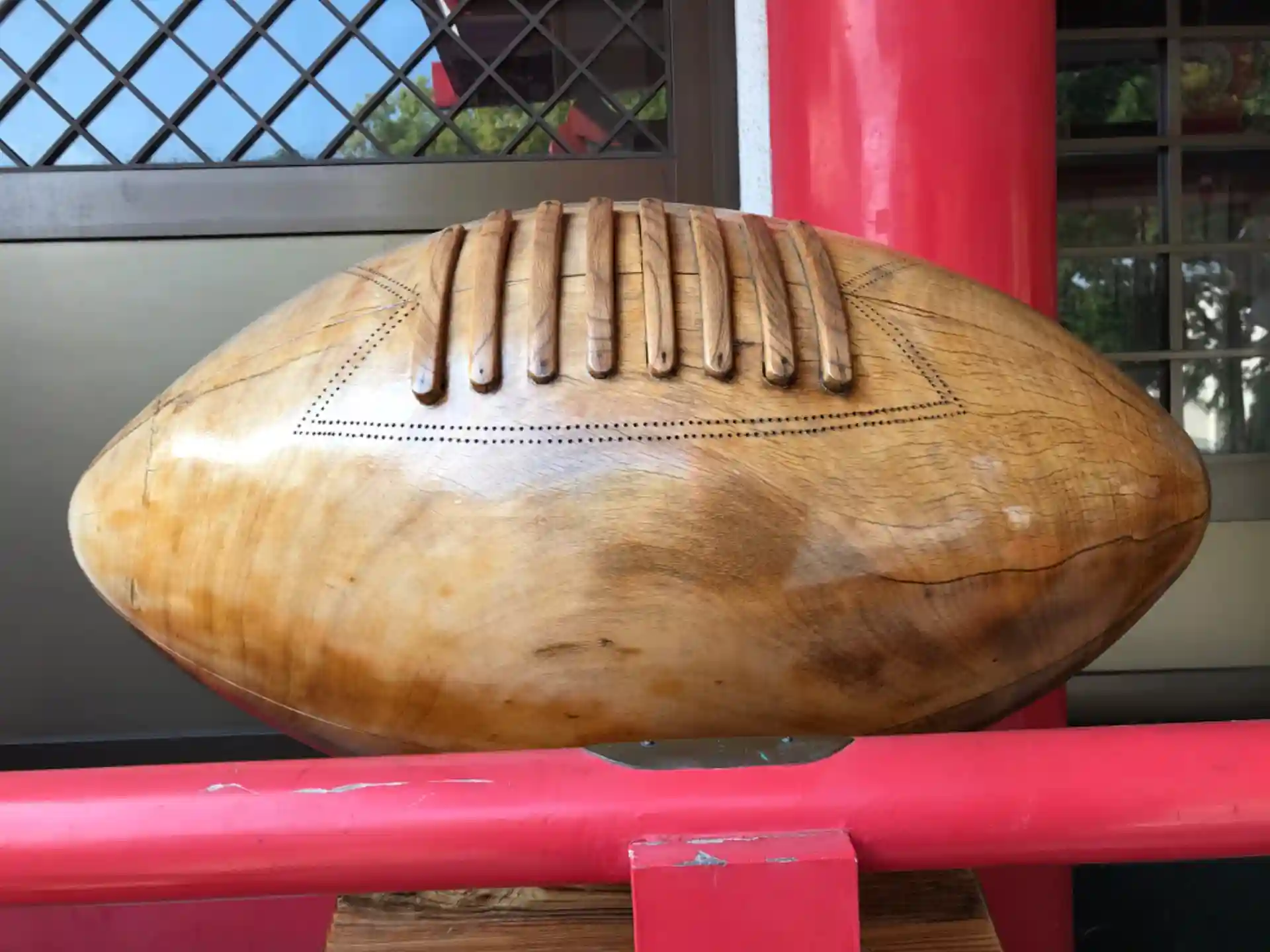 拝殿の側に大きな木製のラグビーボールが奉納されており、触りながら、参拝すると願いが叶うと言われています。