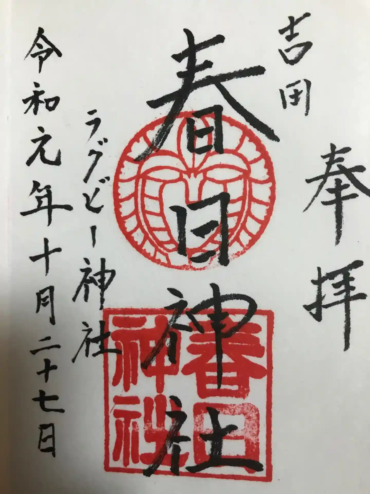 通常御朱印です。ラグビー神社と書かれています。