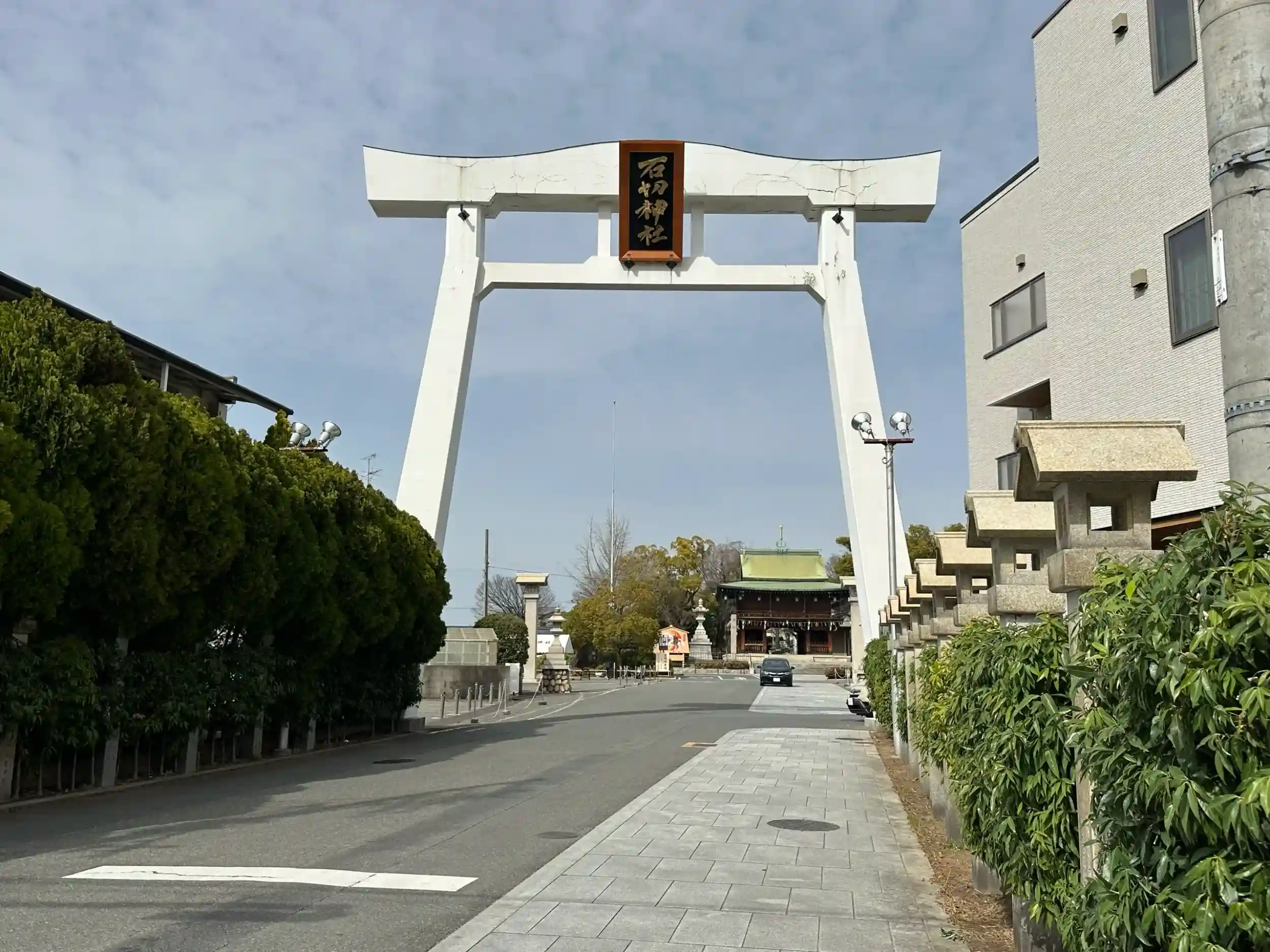 従来の鳥居の形とは違う独自のデザインです。当社をはじめ東大阪の神社は神社本庁傘下ではない神社が多いそうなので、なにかしら意図があるのかもしれませんね。