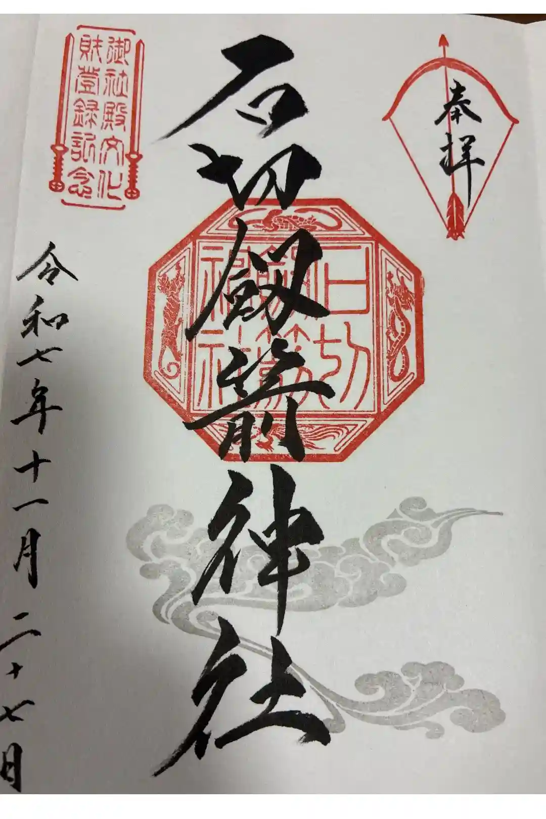 裏面に御神紋と神社印が入り、上に雲が浮かび、下に御宝刀の石切丸が描かれています。