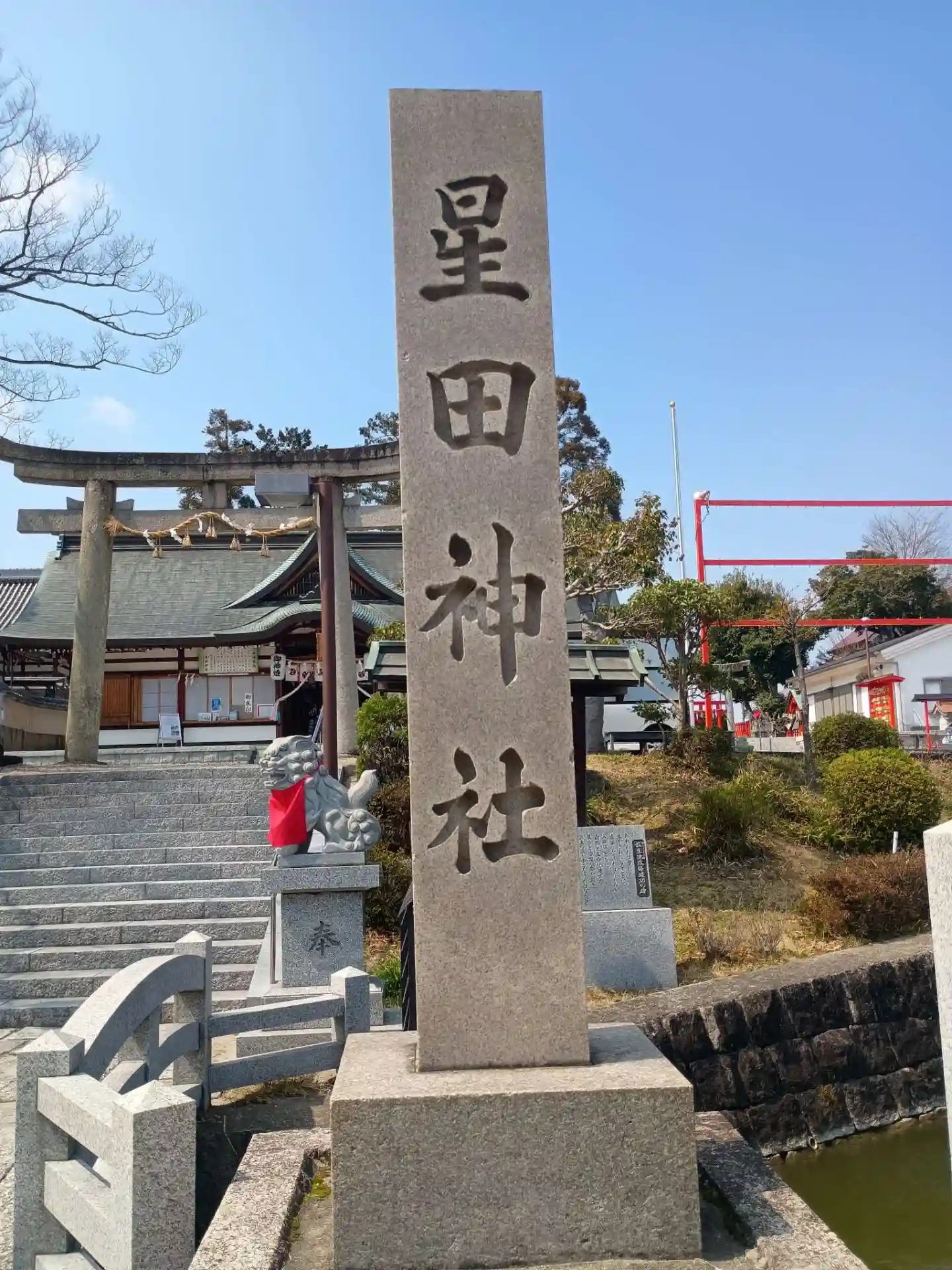 星田駅より徒歩10分超。 神社の鳥居の前に堀があり特徴的。同じ境内に読み方が異なる星田寺(しょう…