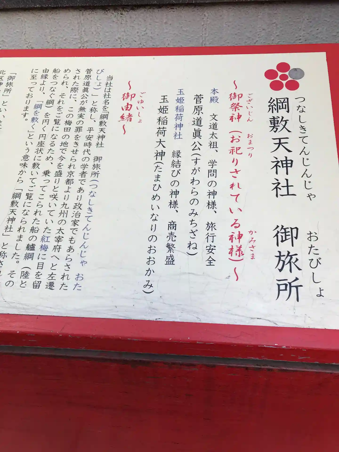 「綱敷」とは菅公がここで梅を見る際に、船の艫綱(ともづな)を円状に巻いて敷いた上にお座りになられた故事に由来しているとのことです。