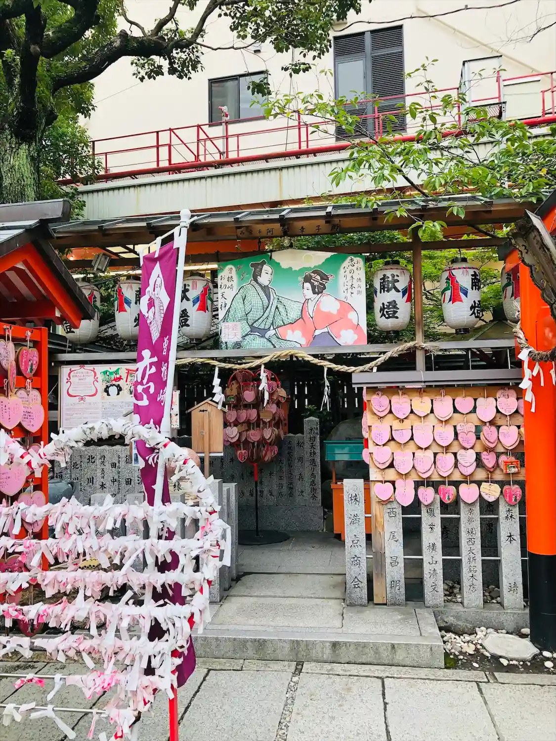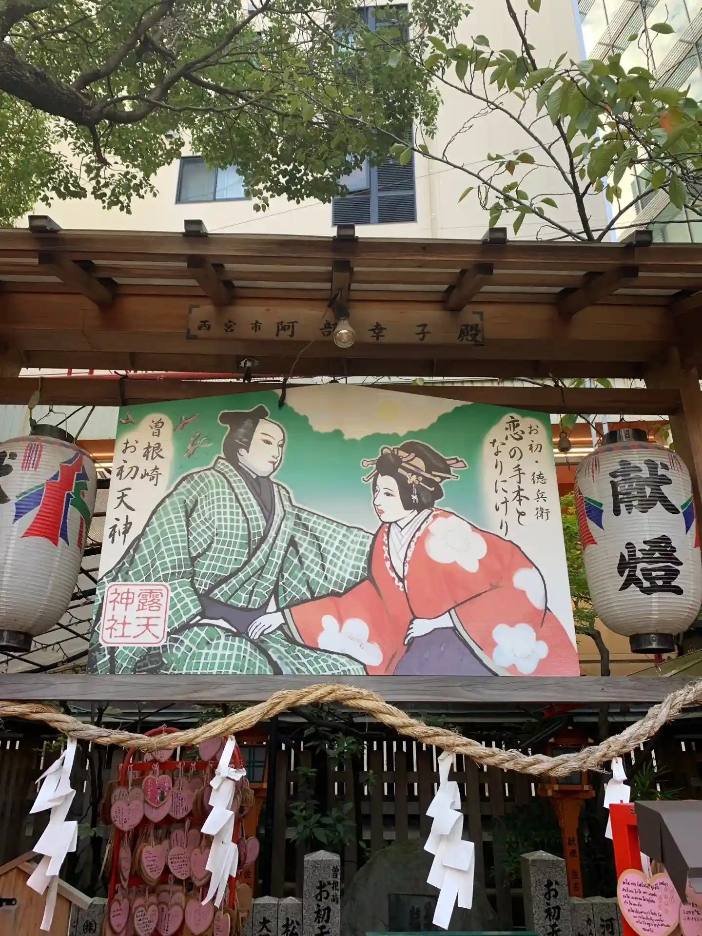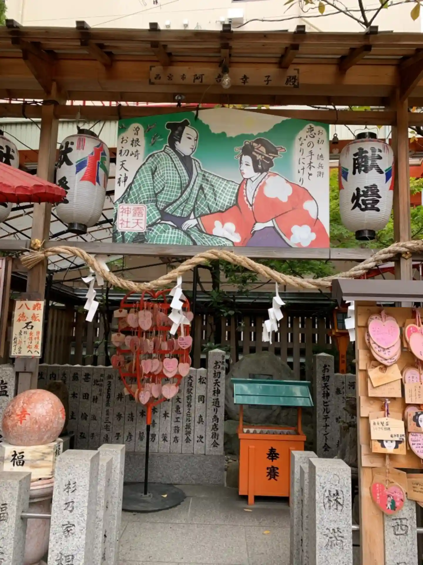 『曽根崎心中』はこの神社の裏手で実際に起きた恋人の心中が実話となっています。ここにいらっしゃる恋人たちも、破局はないでしょうが最後はハッピーエンドで終わってほしいですね。