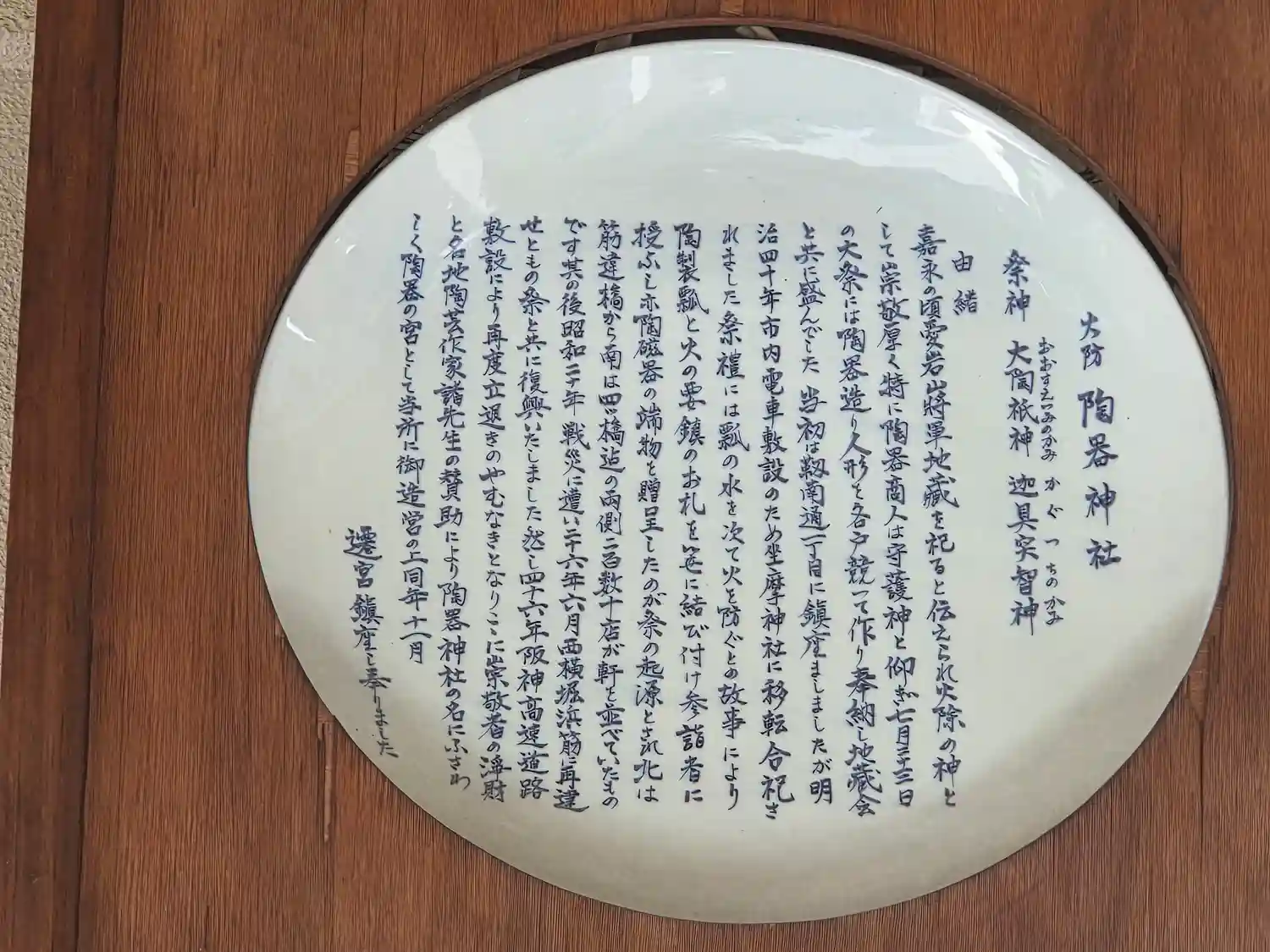 その後、西横堀川に阪神高速道路が建設されることとなり、昭和46年、崇敬者の浄財と各地陶芸作家諸先生の賛助を得て、再び坐摩神社の境内に現在の社殿が造営された。