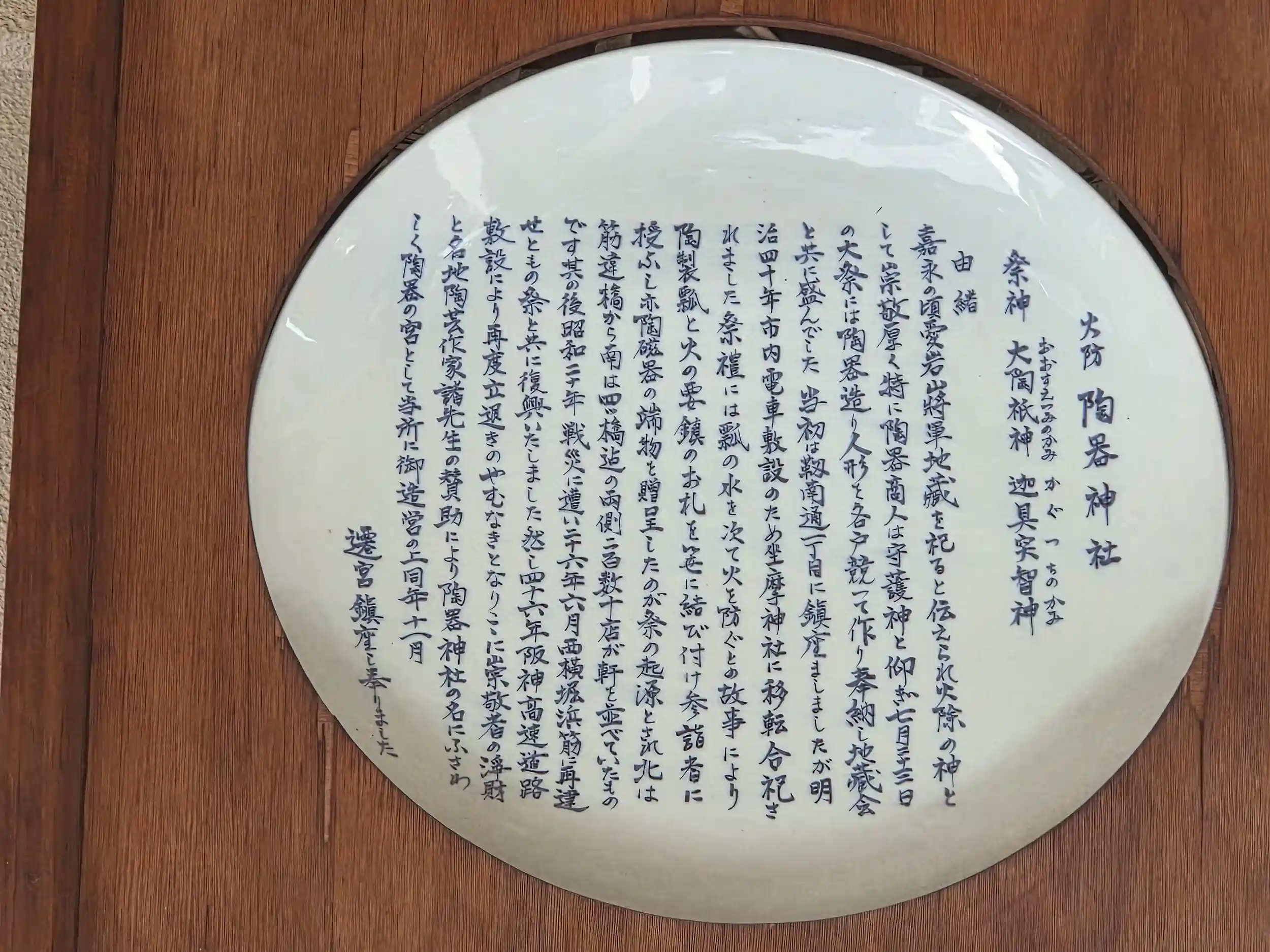 然し四十六年阪神高速道路敷設により再度立退きのやむなきとなりここに崇敬者の浄財と各地陶芸作家諸先生の賛助により陶器神社の名にふさわしく陶器の宮として当所に御造営の上同年十一月遷宮鎮座し奉りました。