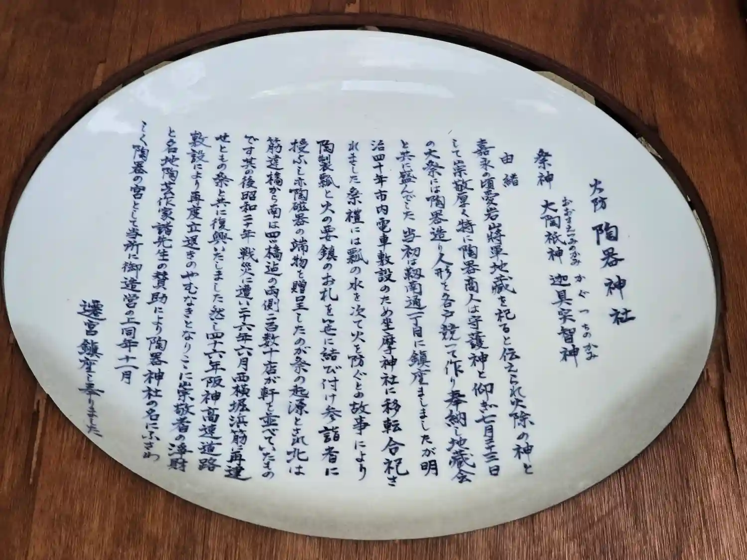 ご祭神は、大陶祇神、迦具突智神、筋違橋から南は四ツ橋までの両側に二百数十軒あった陶器問屋街の守護神…