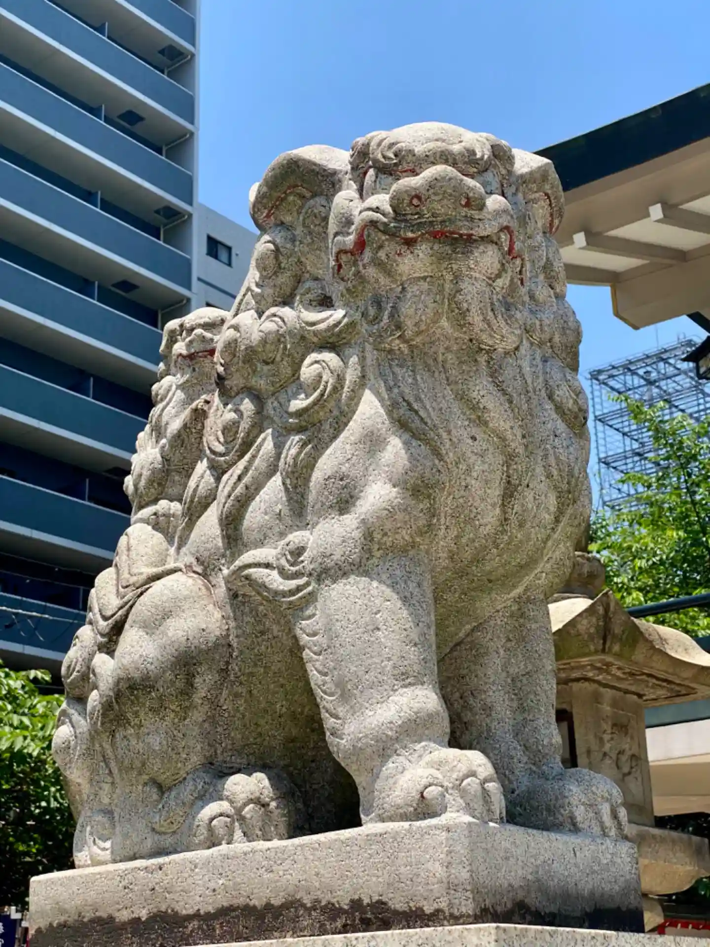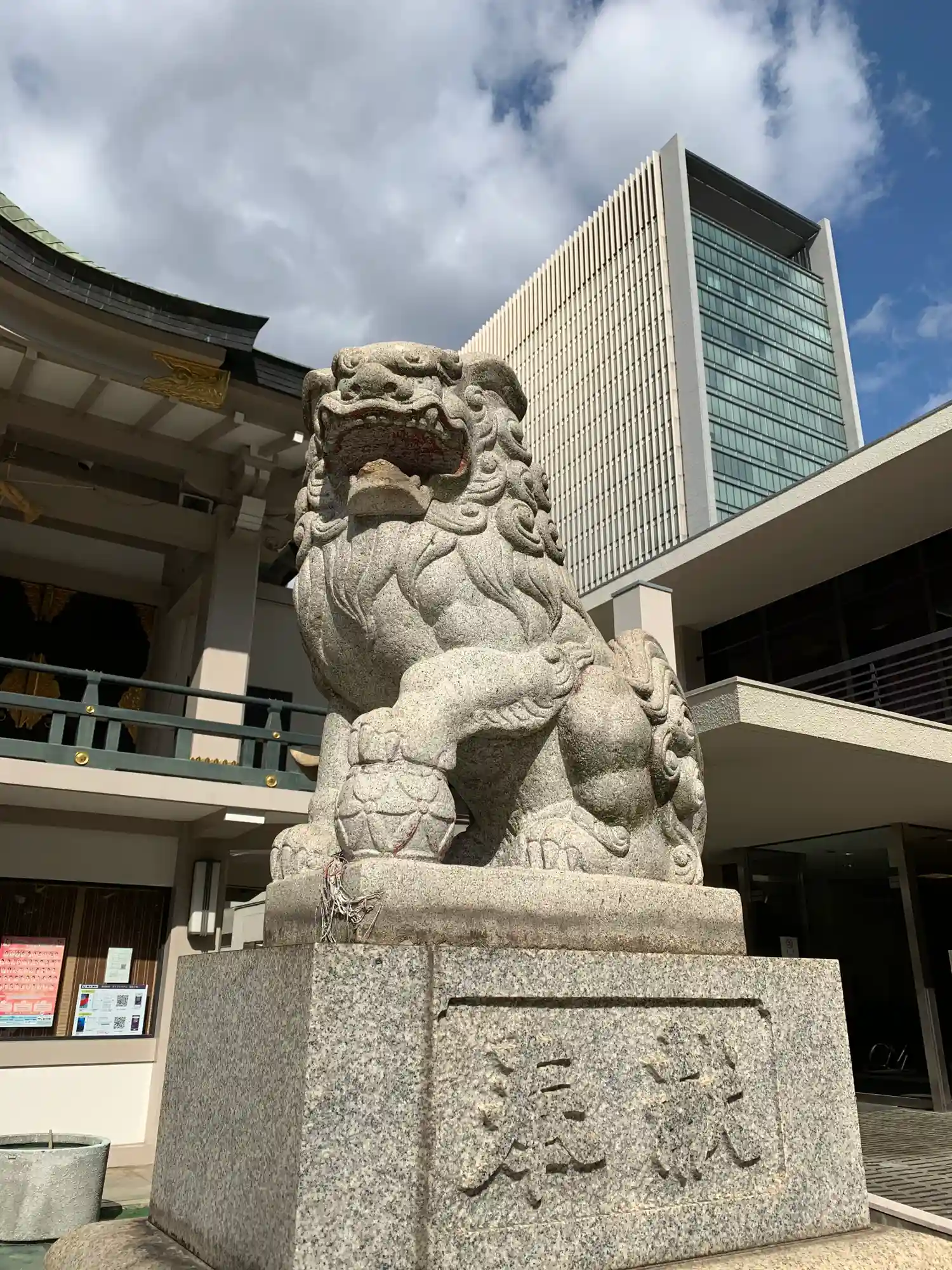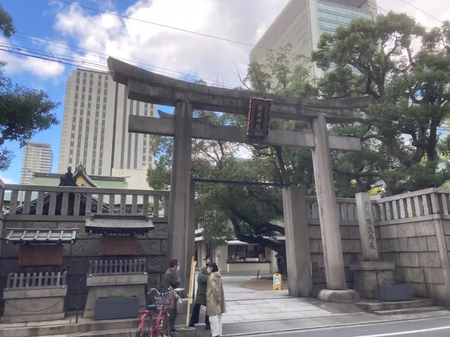 難波三社巡り 仁徳天皇をご祭神として創建されたと伝わります、おんぶ狛犬がいます、ビル街に囲まれた神…