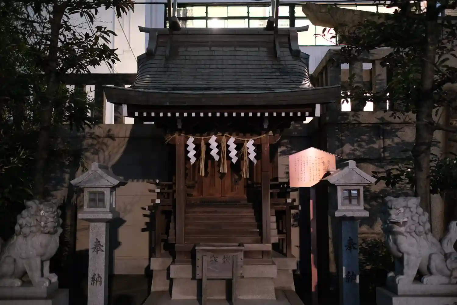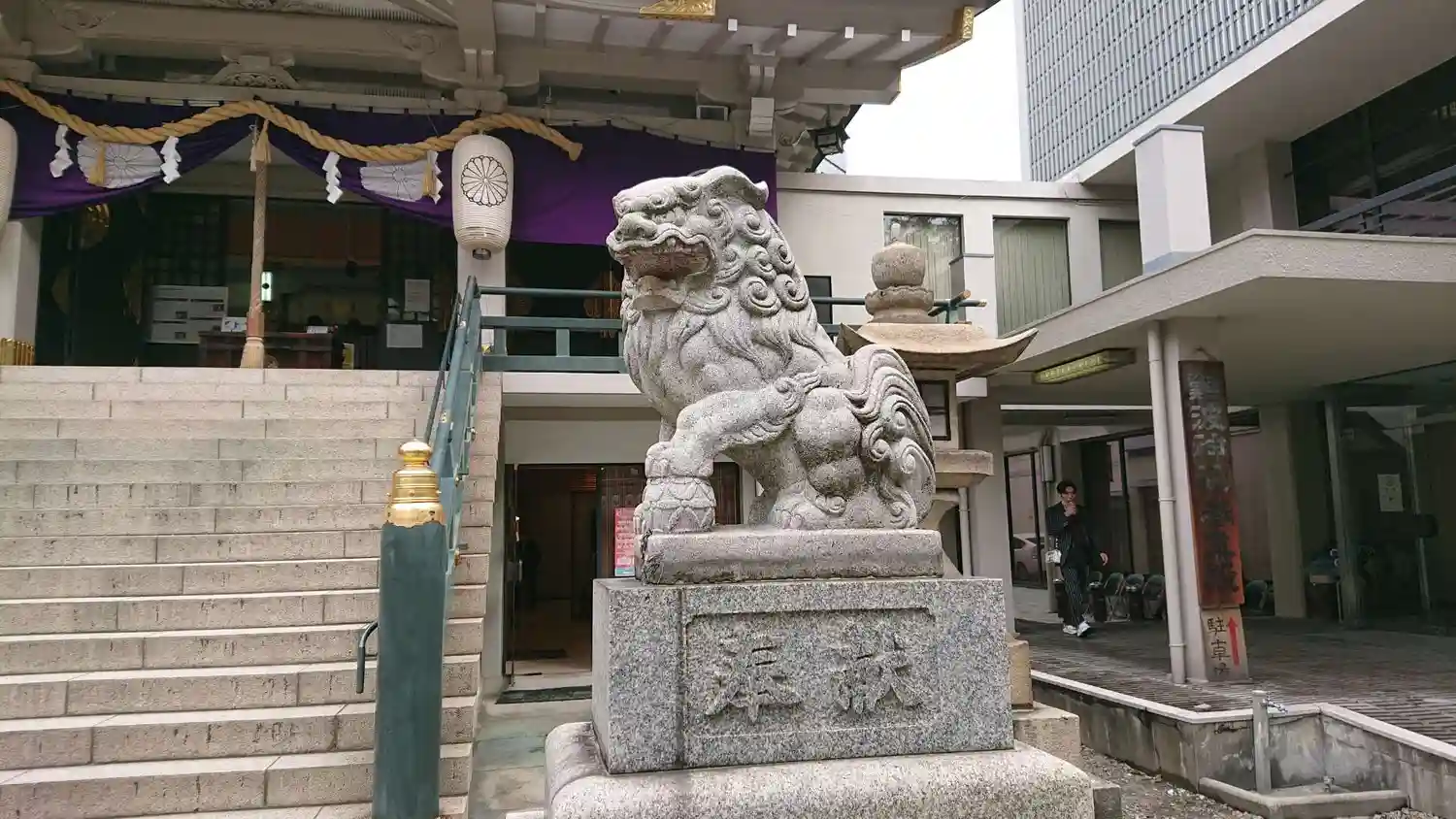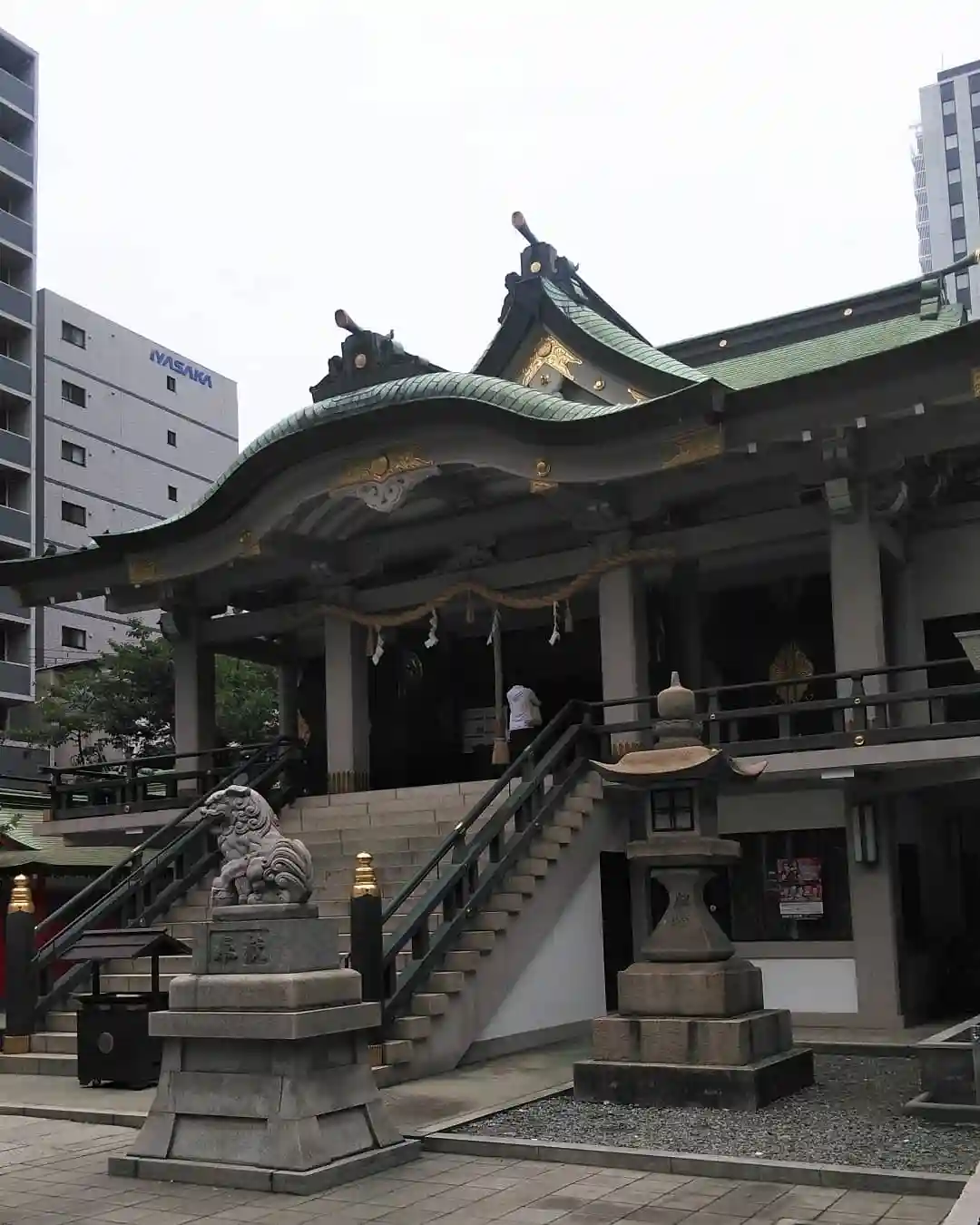 難波三社巡り 仁徳天皇をご祭神として創建されたと伝わります、おんぶ狛犬がいます、ビル街に囲まれた神…