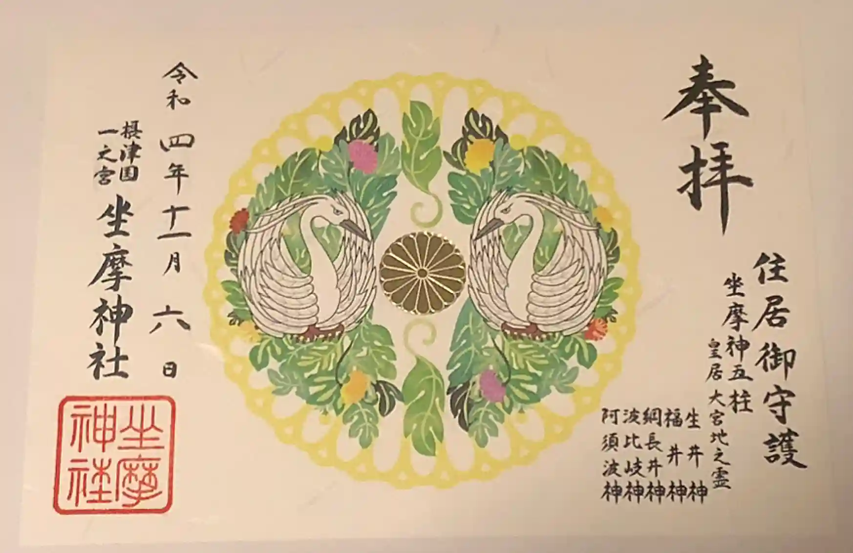 神紋が白鷺なのは、神功皇后が坐摩の神の教えにより白鷺の多く集まる場所に坐摩神を奉遷なされたことに由来します。