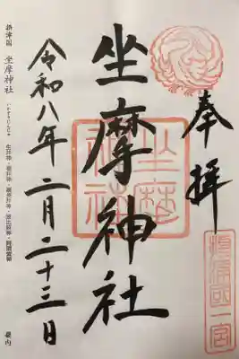 真ん中に「坐摩神社」と墨書きされ、神社印が重ねられています。右上に神紋の鷺(さぎ)、右下に「摂津國一宮」の印が押されています | |||