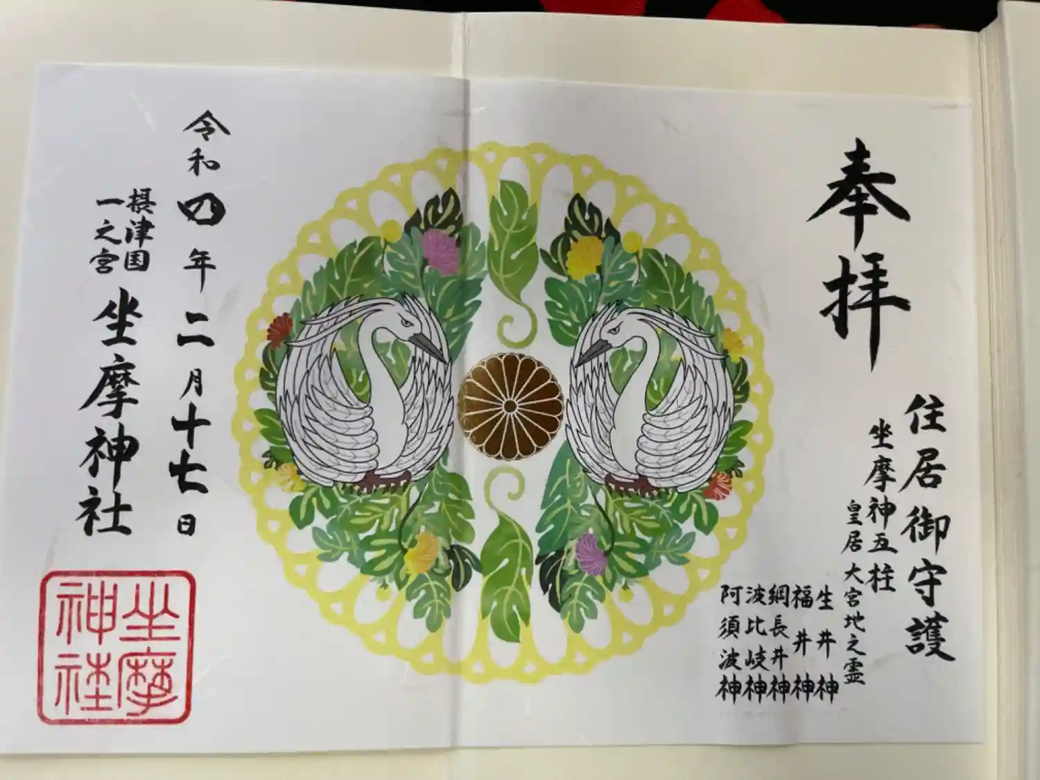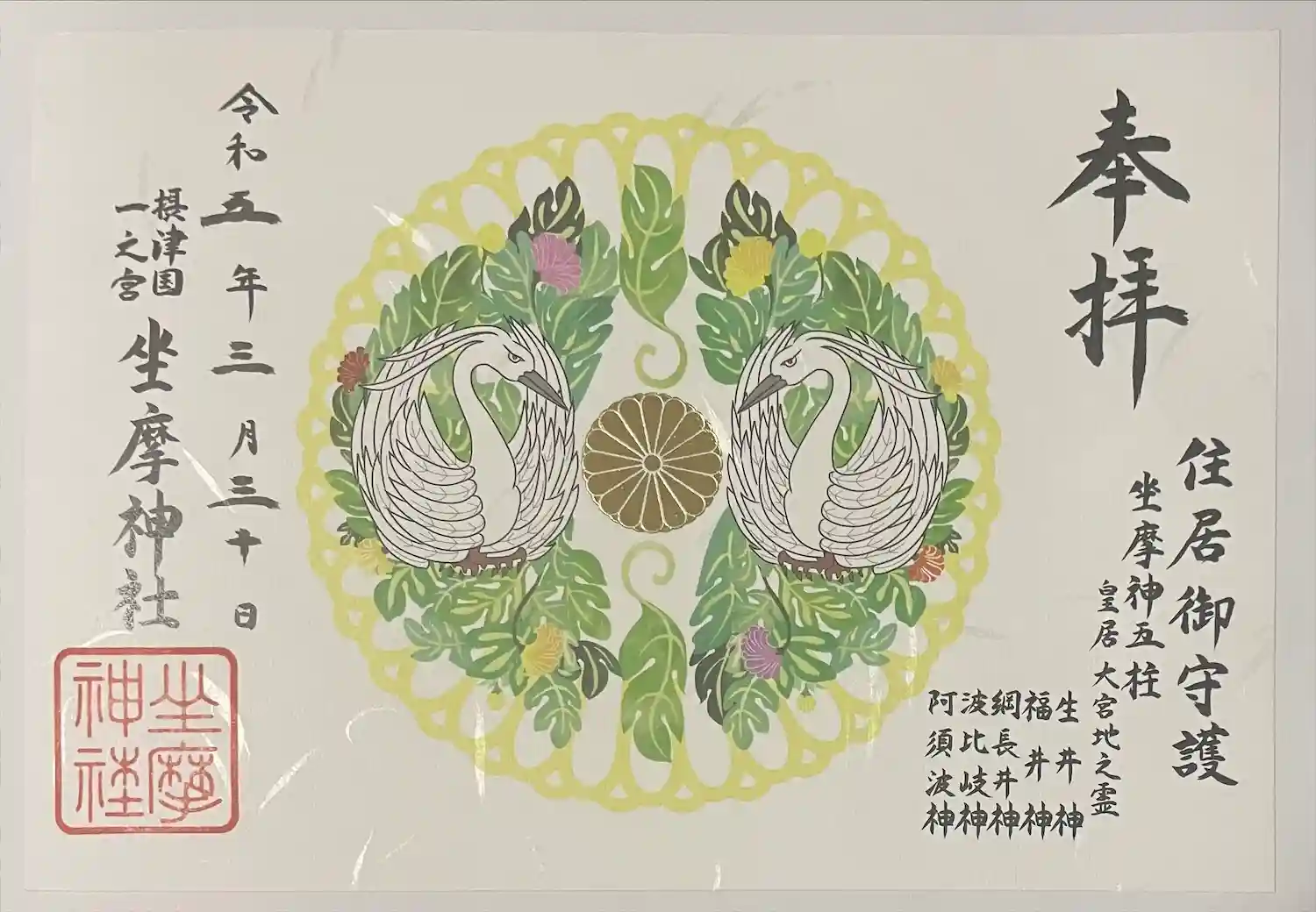 ご祭神 春日 住吉 大神受美 猿田彦 大宮比賣 多賀 天御中主 産靈 直比 諏訪 事平 大歳 (敬称略)
