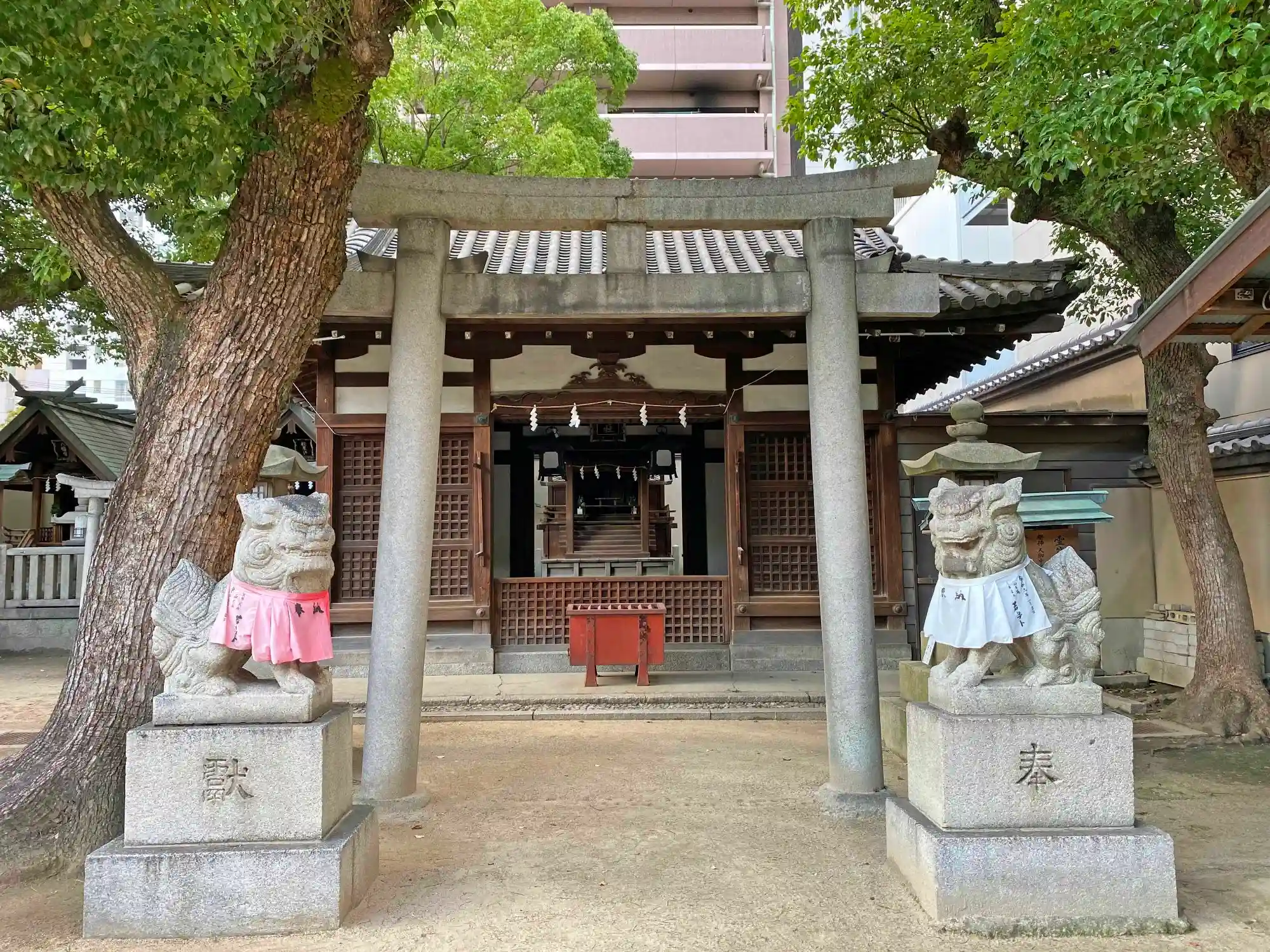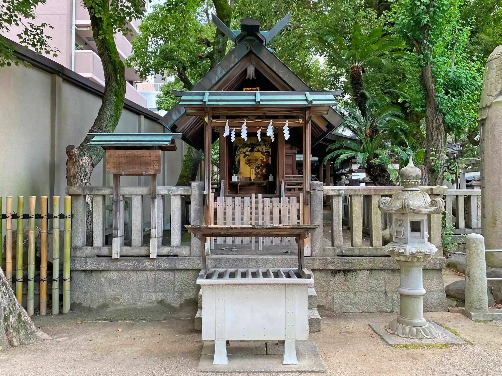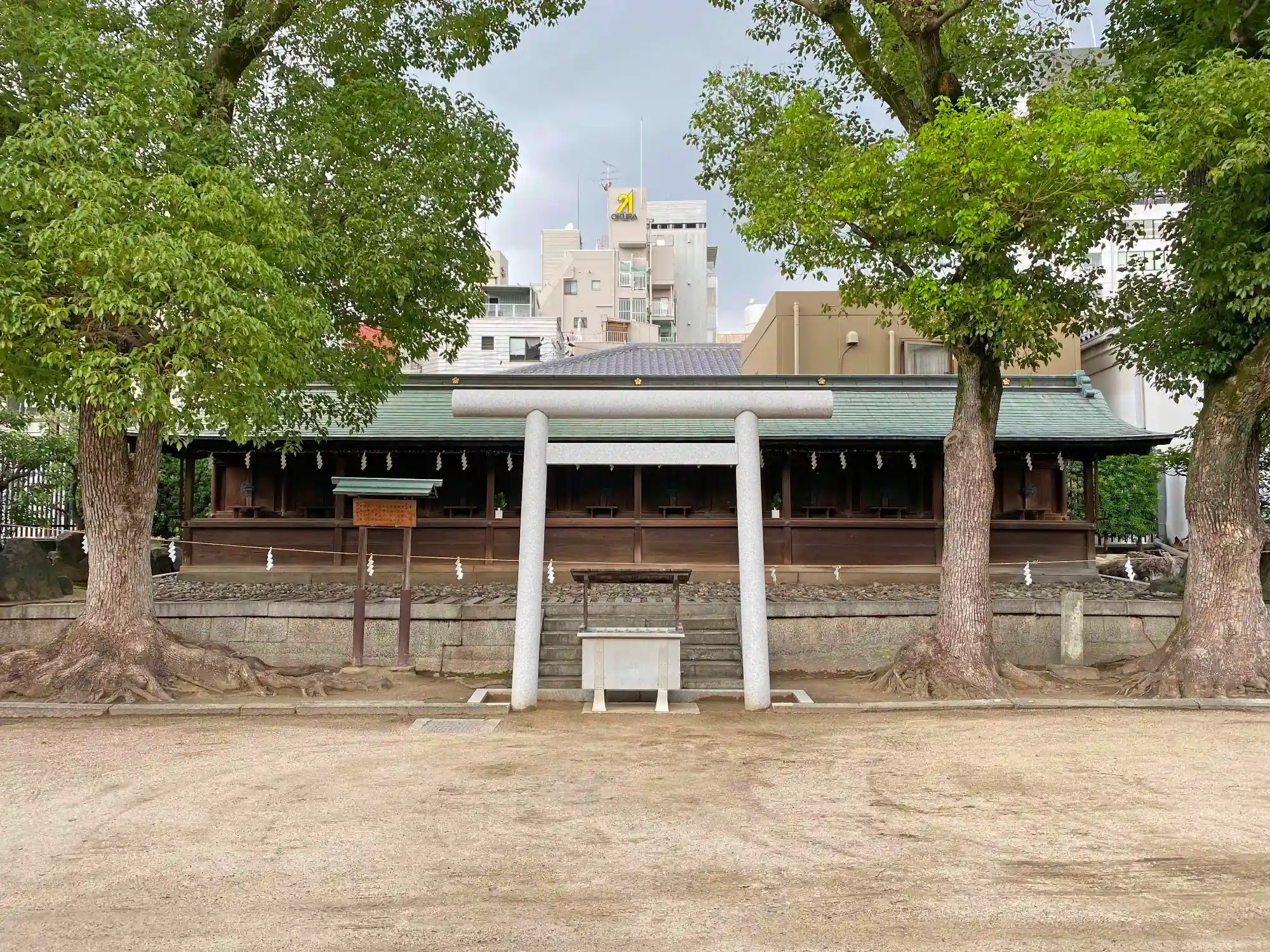 当社は、JR東西線・大阪天満宮駅の南側100m、大阪メトロ堺筋線・谷町線・南茂里町駅の南東側200mほどの繁華街にある。都会のど真ん中にあるのに敷地はかなり広い。ただし、その広い敷地には、社殿以外にも大きな建物がいくつも建ち、また<神社のデパート>と言えるぐらいたくさんの境内社があるため、ぎゅうぎゅうで密度が高い。このため、じっくり見て廻ると相当時間がかかる。さすが大阪を代表する神社というだけある。