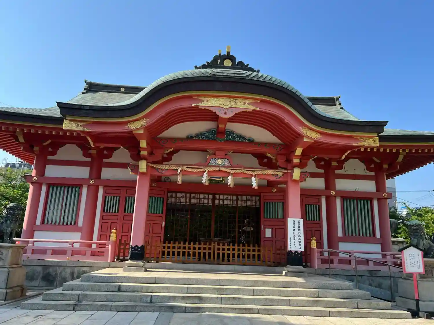 朱色の拝殿が鮮や…