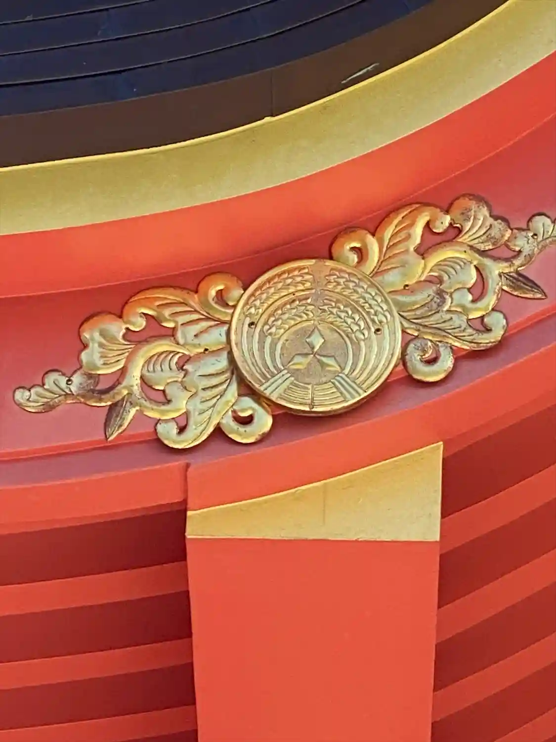 稲荷神社のマークである稲穂の真ん中に、三菱グループの象徴であるスリーダイヤが置かれている。