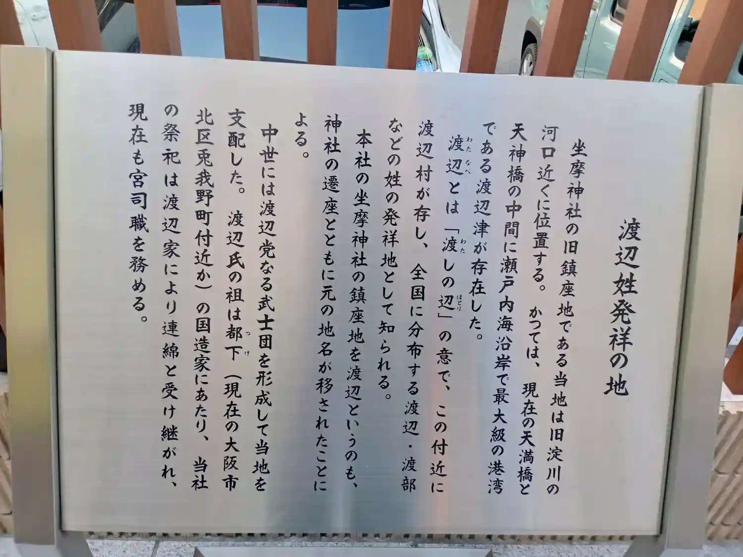 もっと読む坐摩神社の旧地です。社伝によれば神功皇后が三韓征伐の帰途、淀川河口南岸にあたる当地、大江の岸・田蓑島の地に神を祀ったと伝えています。