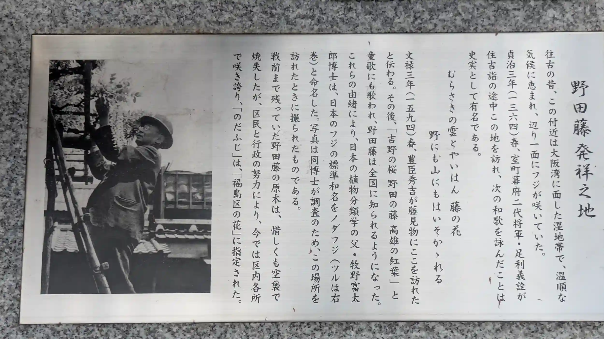 野田藤発祥之地案内。写真はNHK朝ドラ「らんまん」の主人公のモデルであった「牧野富太郎」博士