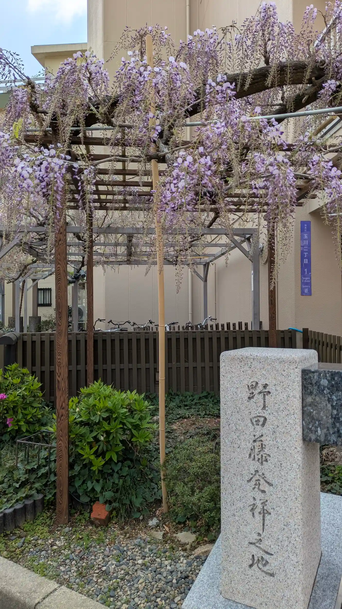 社殿正面の野田藤発祥之地石碑。こちらの藤は7分ぐらいかな?