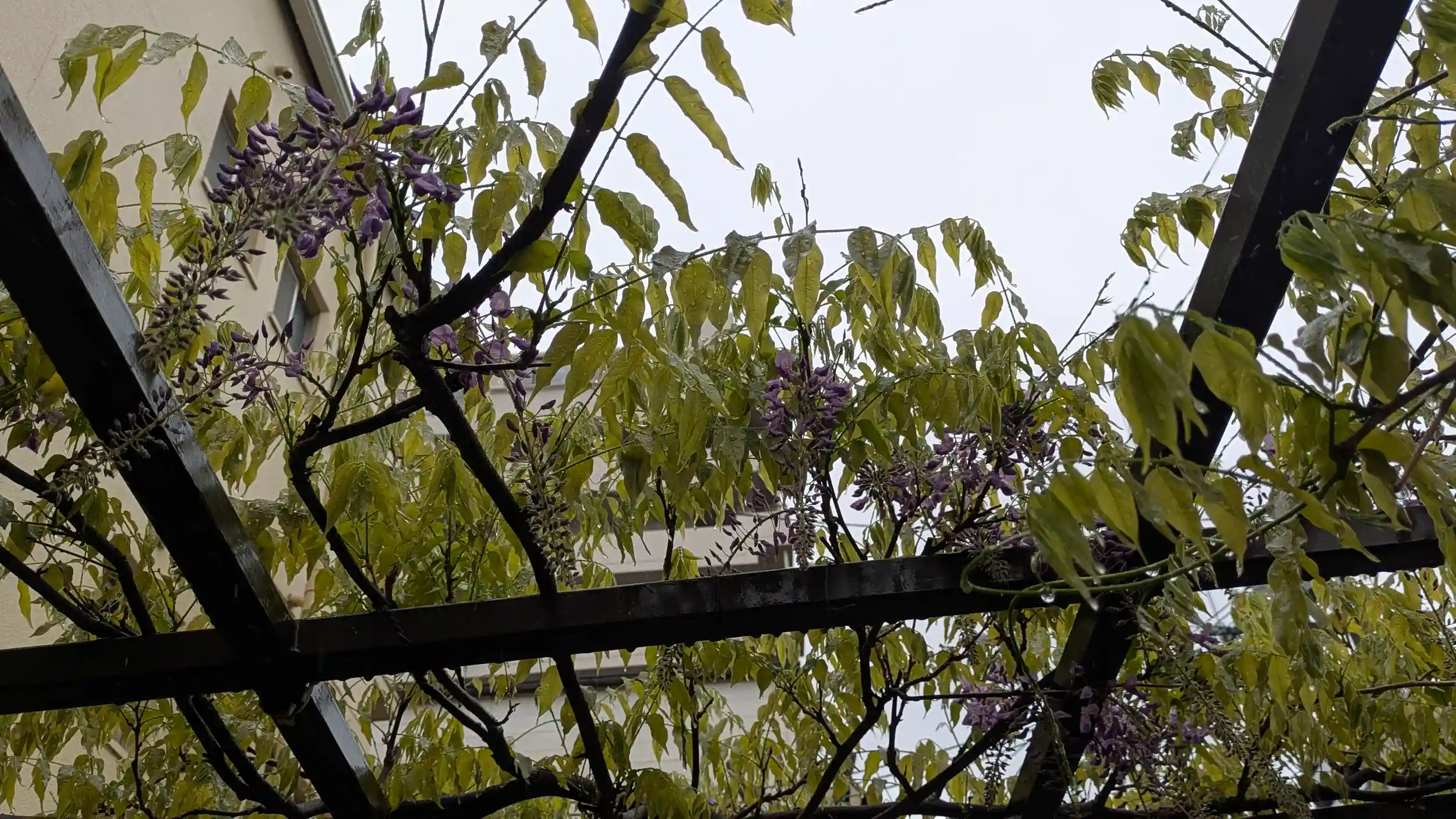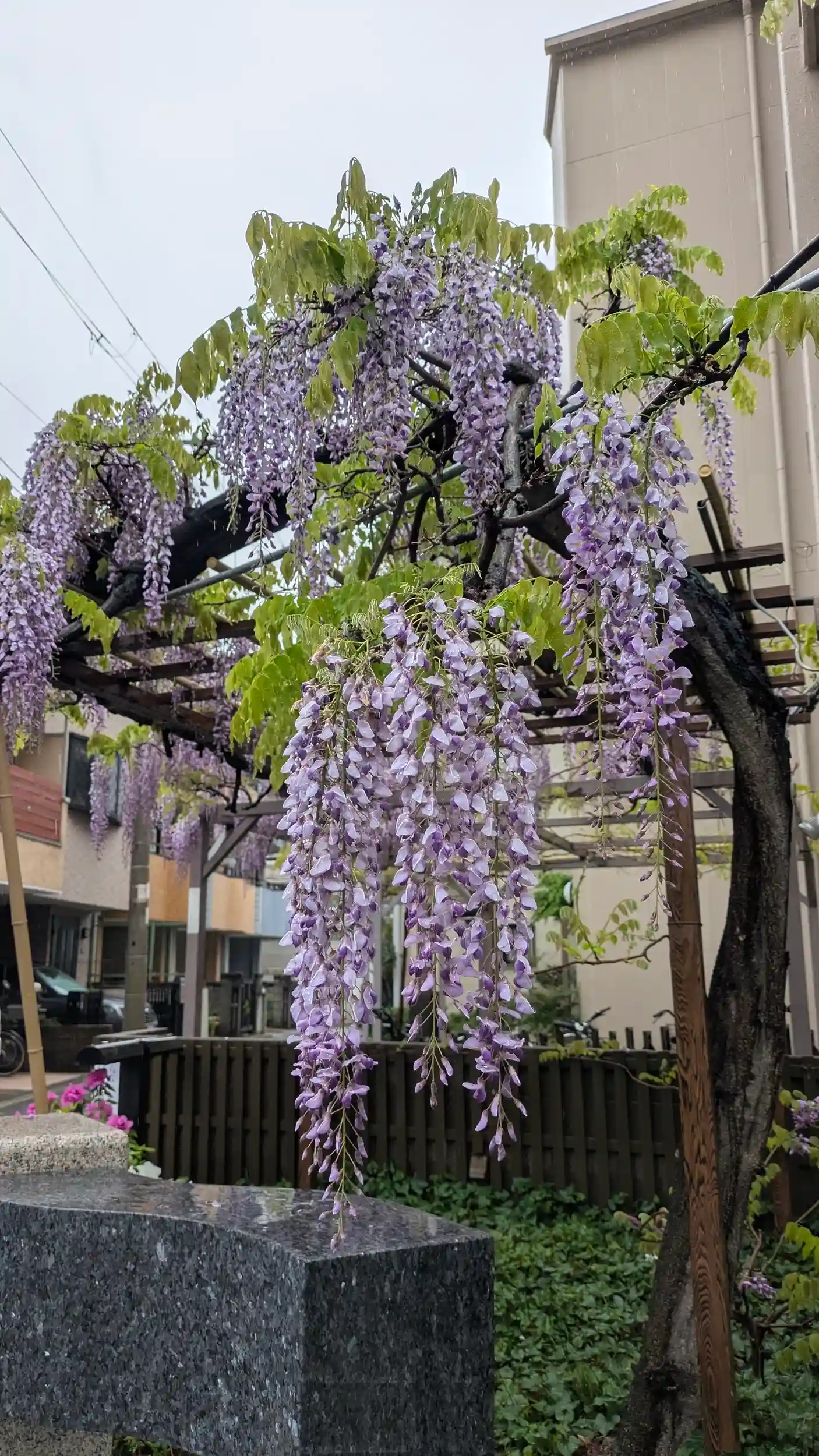 春日神社へ到着。雨足がちょっと弱まったかな?という感じ。社殿側の藤はまだちょろっとでしたが向かいの藤棚は綺麗に咲いておりました😊社殿側は来週ぐらいが見頃かな?臨時案内所も片付けられており、社務所へ向かうも不在・・・😫調べたら15時までやった・・・雨やから早めに撤収されたのか平日だからか・・・今年は御縁いただけずでした😭