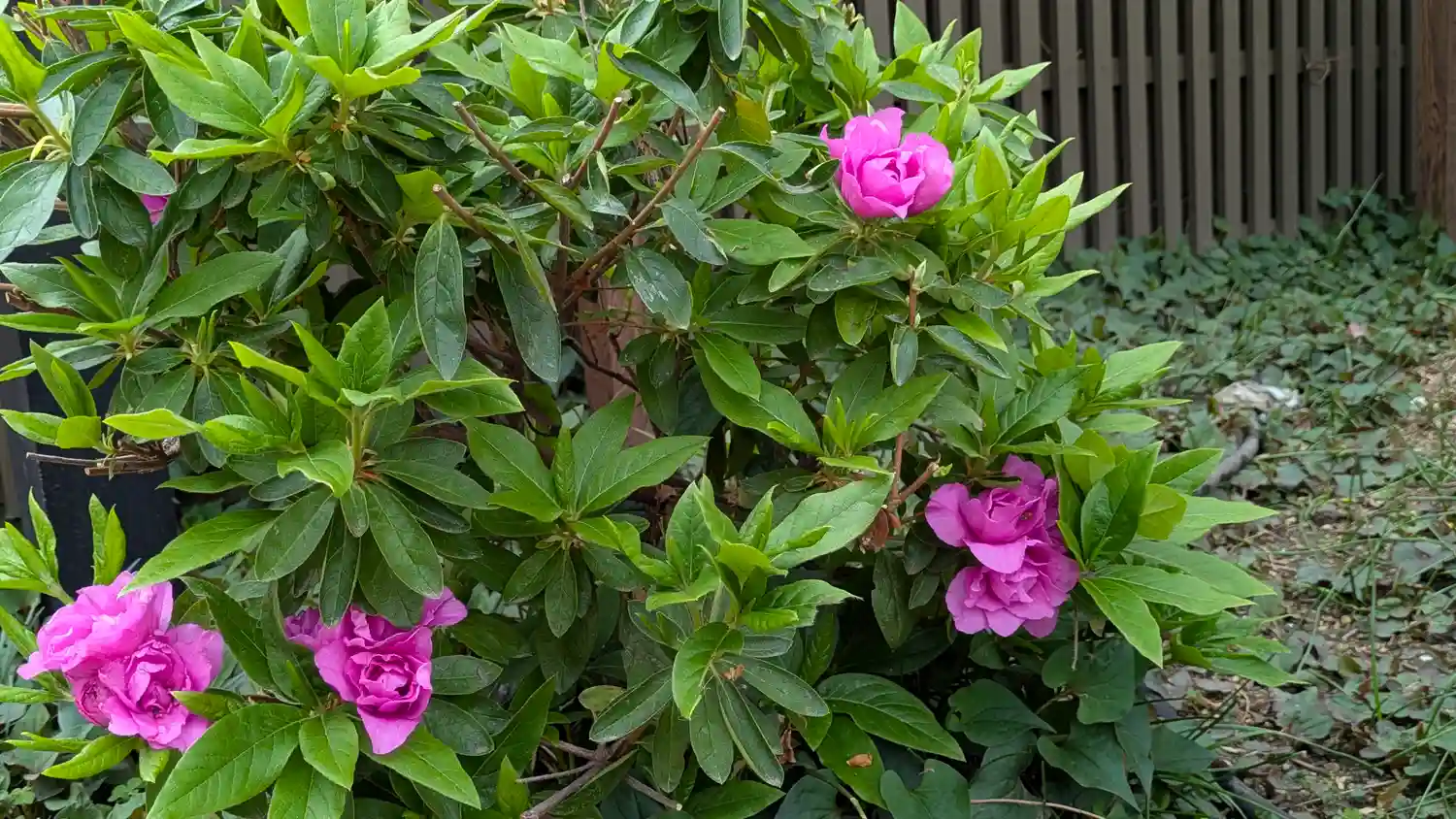 全景。藤棚の幹は隣地にもあり、踏まれて枯れないように工夫されています。
