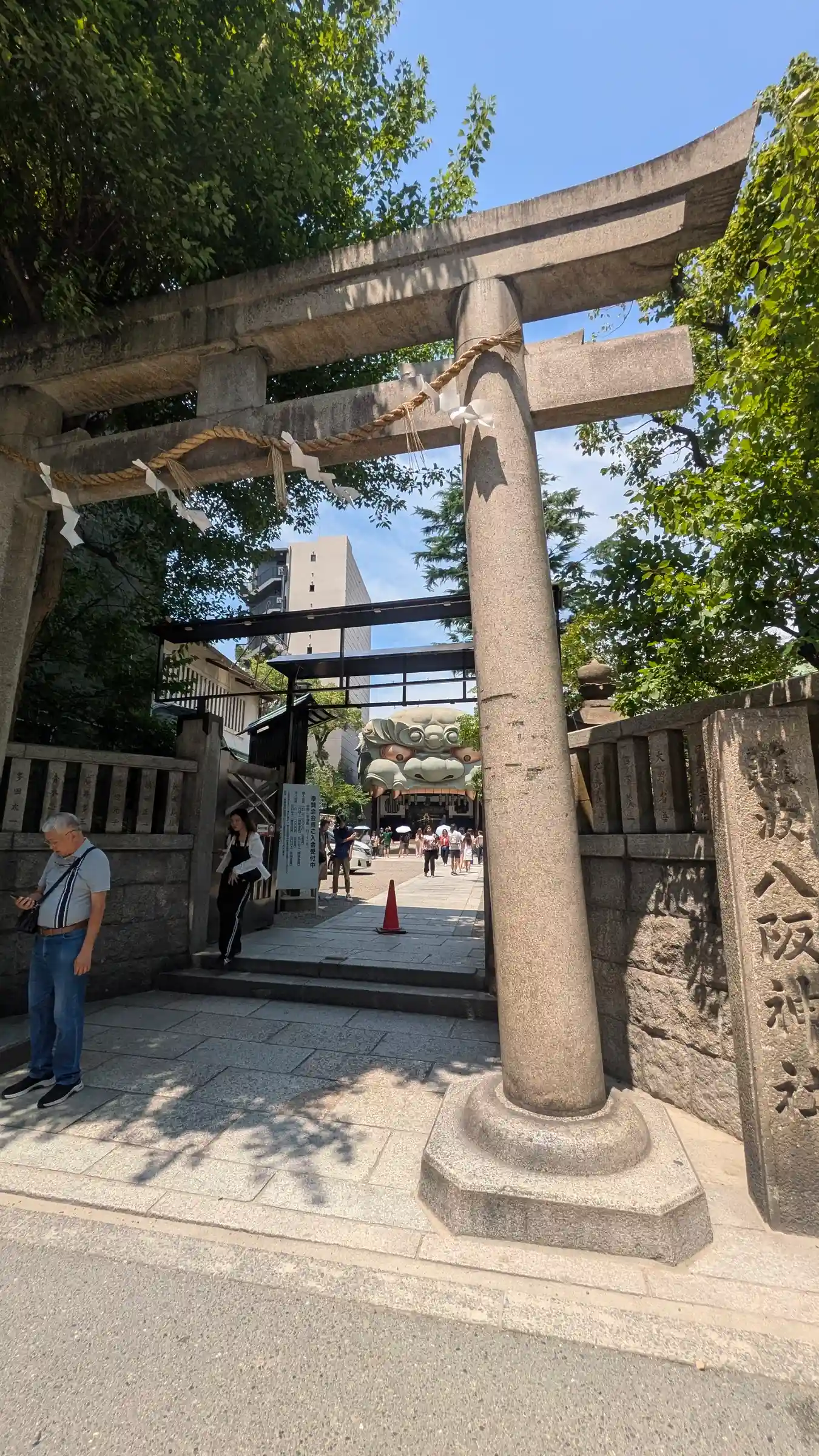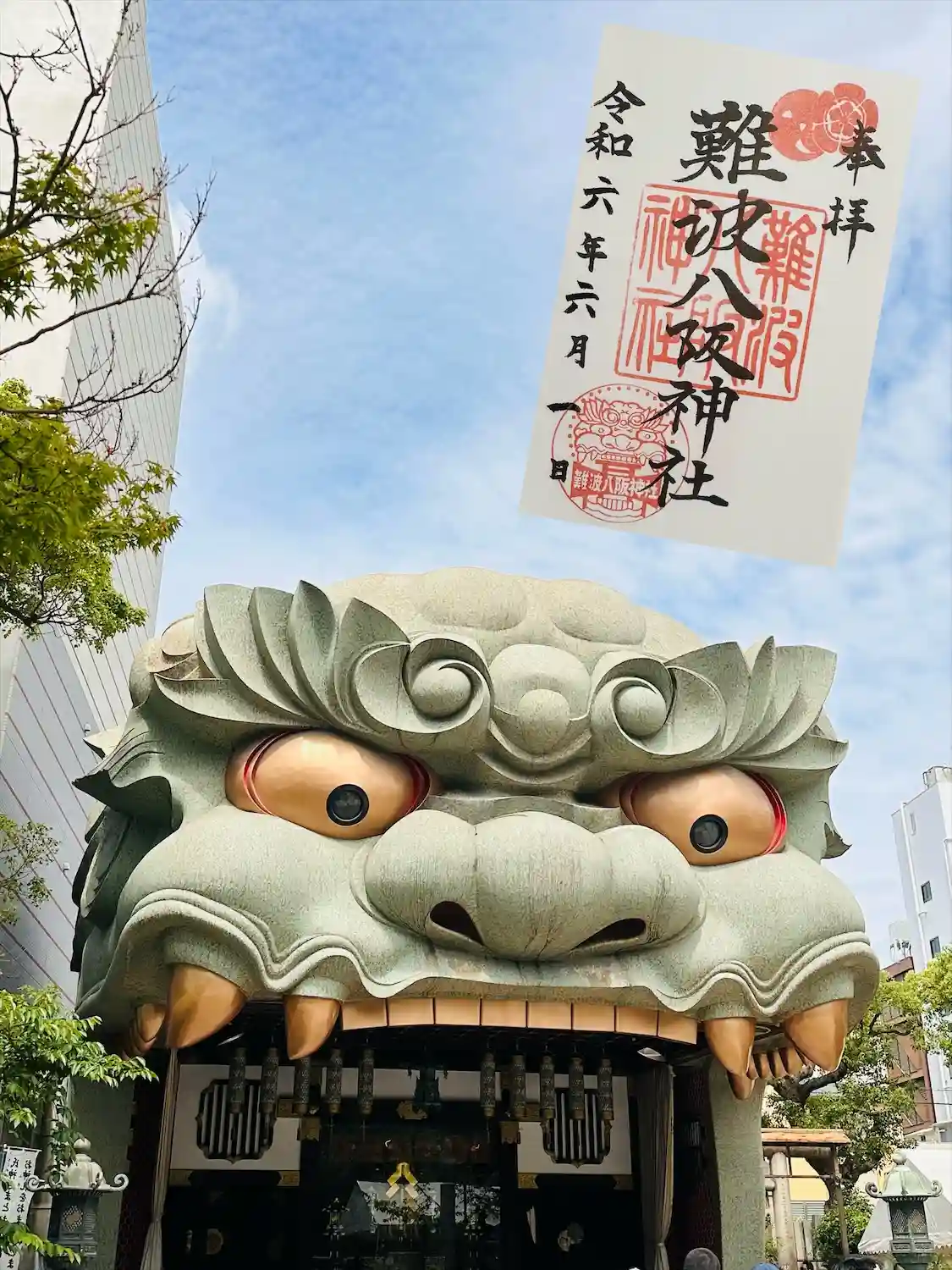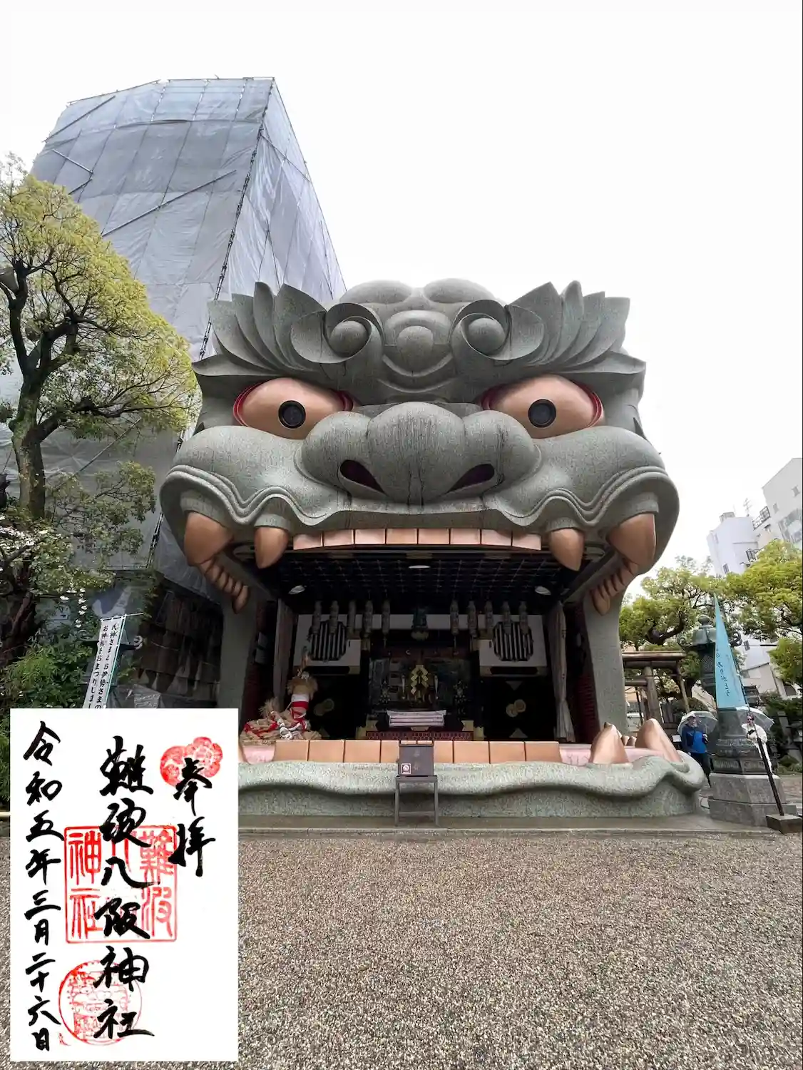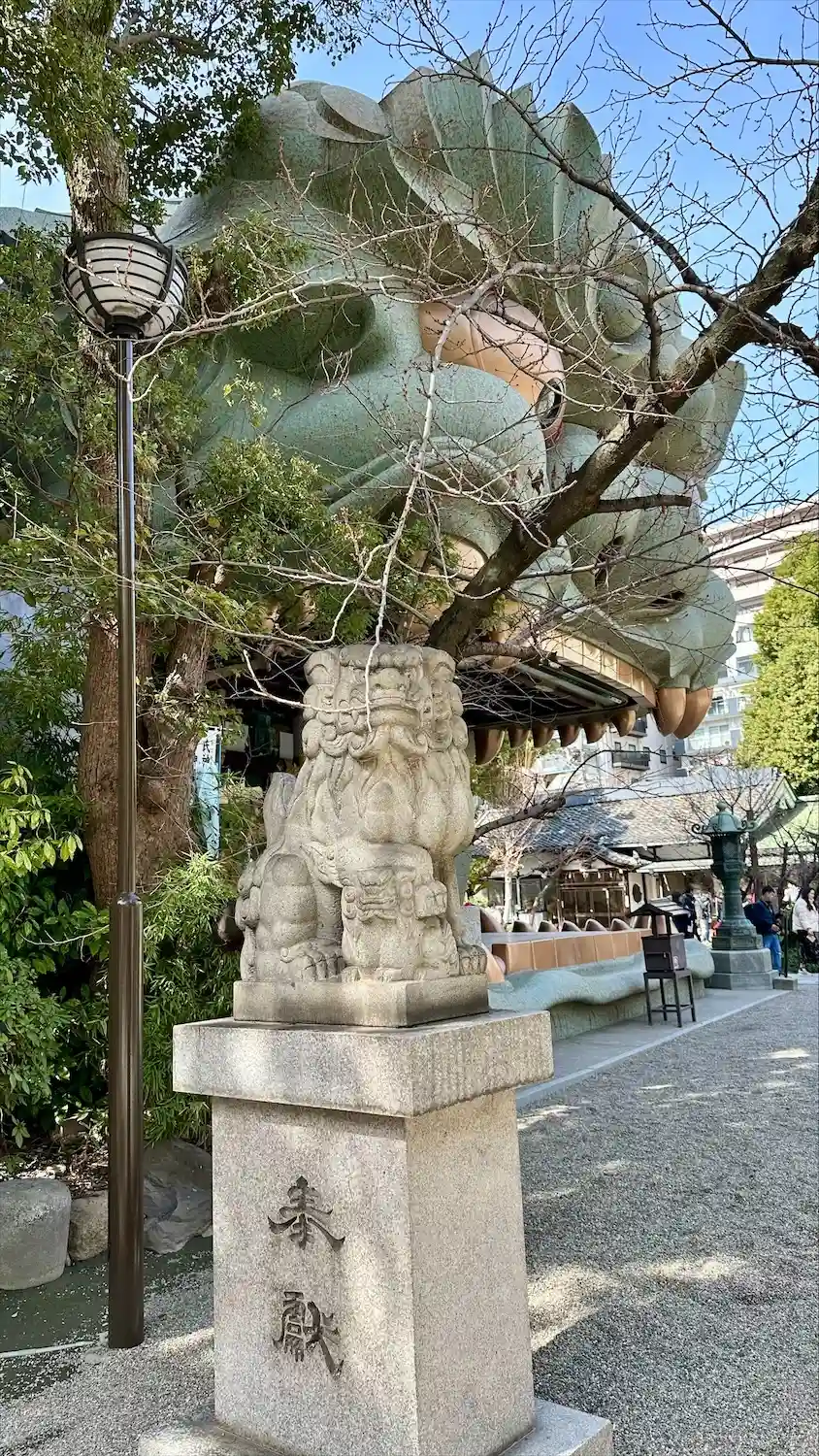 難波八阪神社さんの御朱印を書置きで拝受。こんな大きな狛犬がいるとはほぼ観光地化しとりますね。