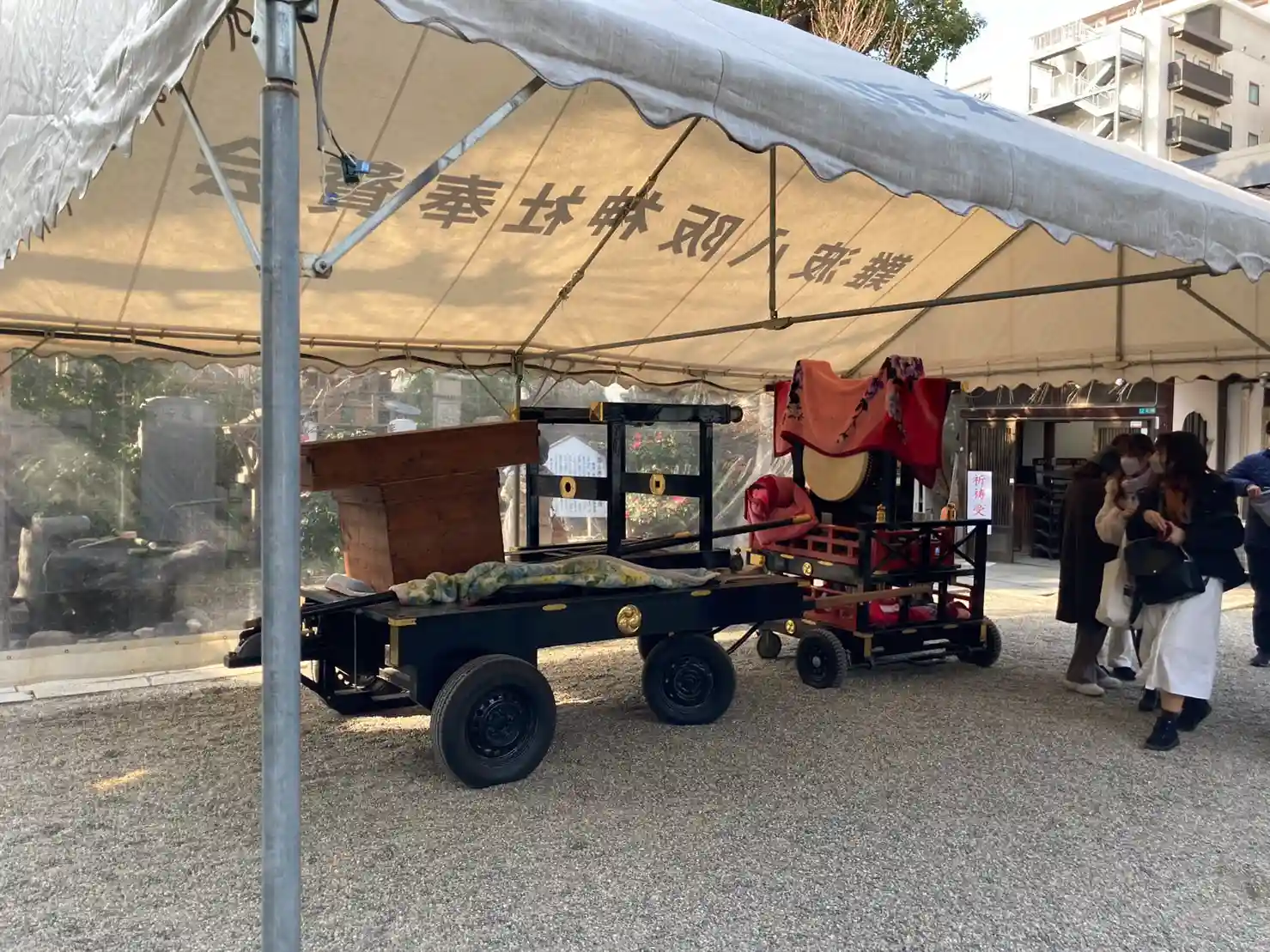 鳥居をくぐる。境内の南半分は夏祭りの準備をしているのか、参道に沿って立て看板の骨組みが立っていた。