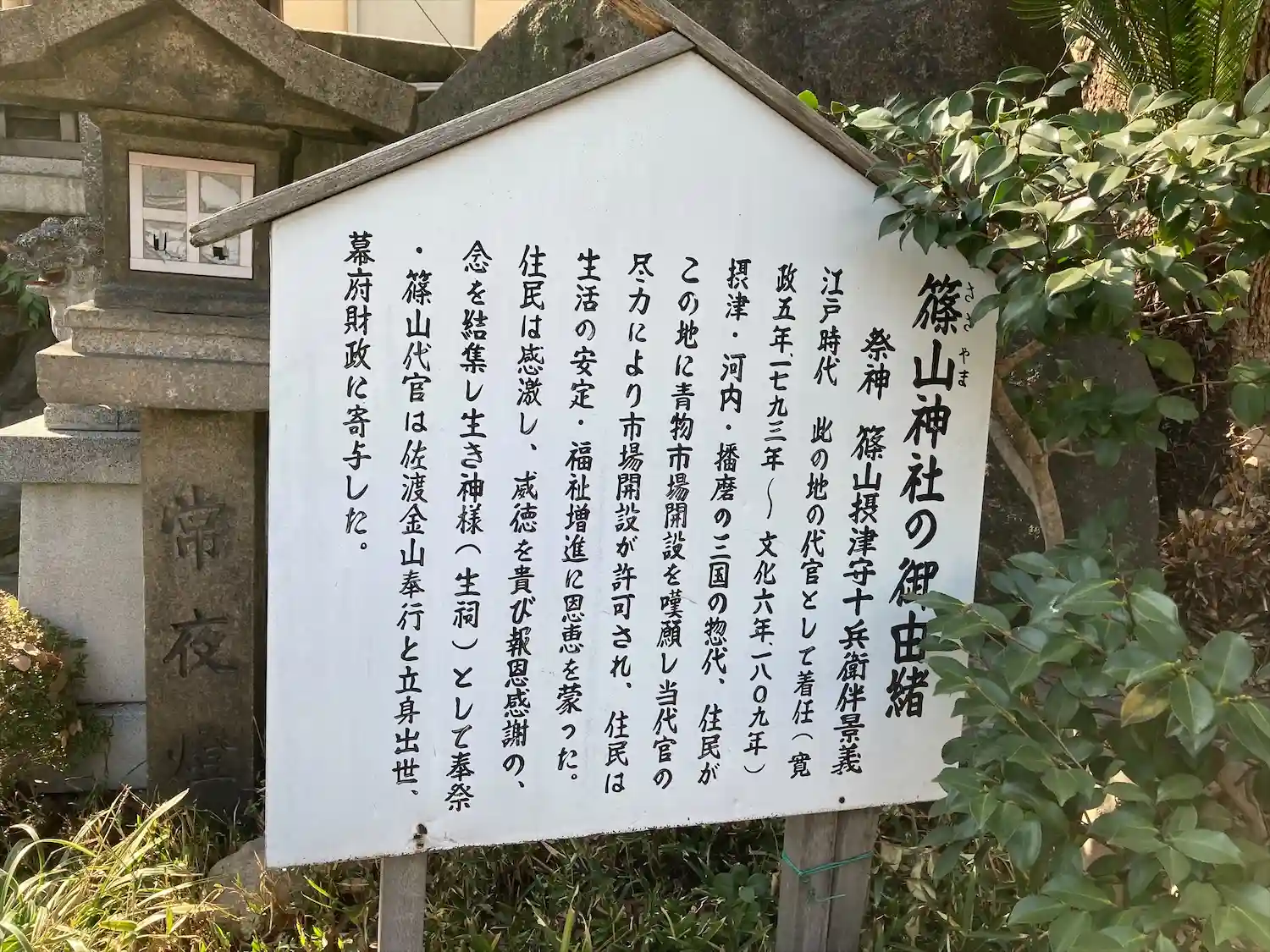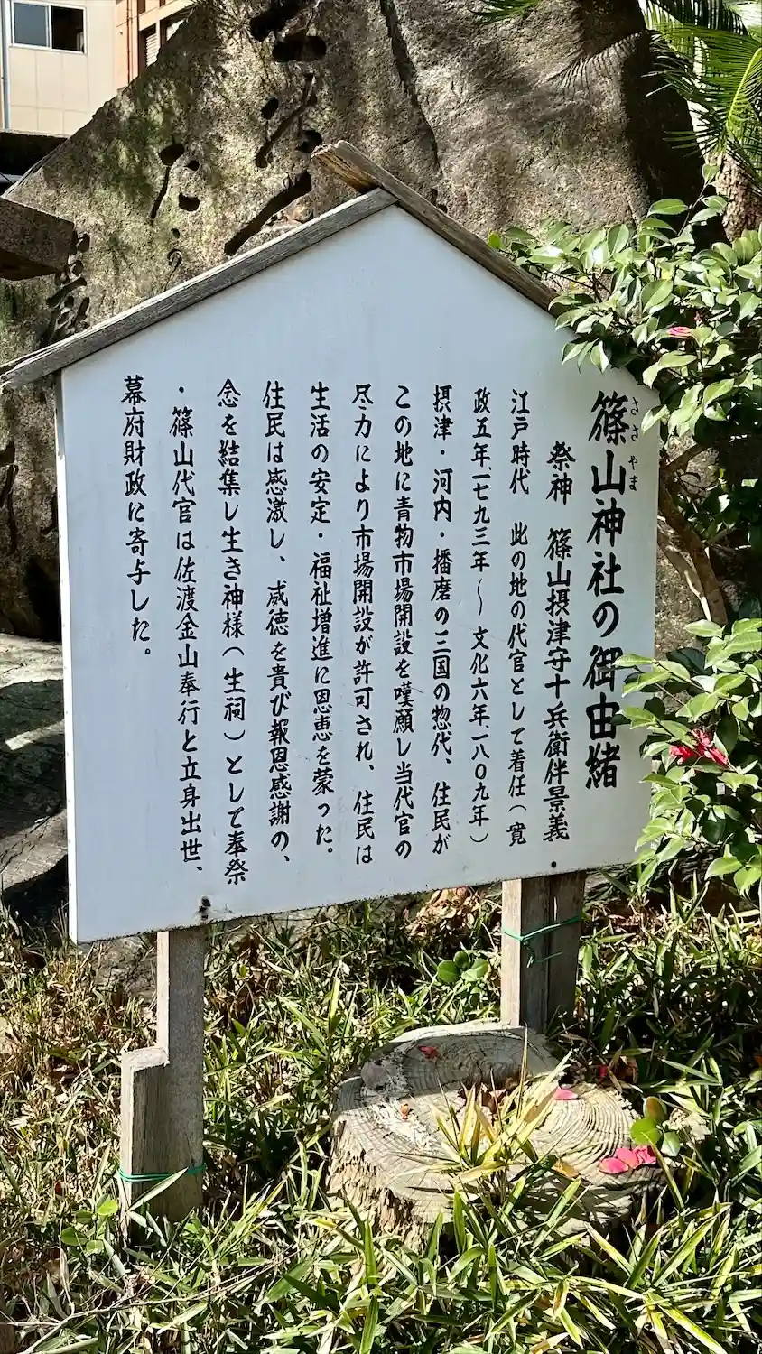篠山神社 難波の発展に貢献した大坂代官篠山十兵衛景義の遺徳を顕彰するため、明治十三年十二月二十六日創建されたものである