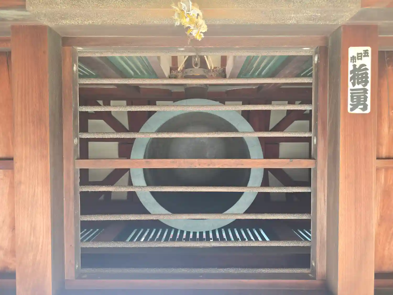 正面から撮影。門をくぐるとき見上げると鐘が見えます。