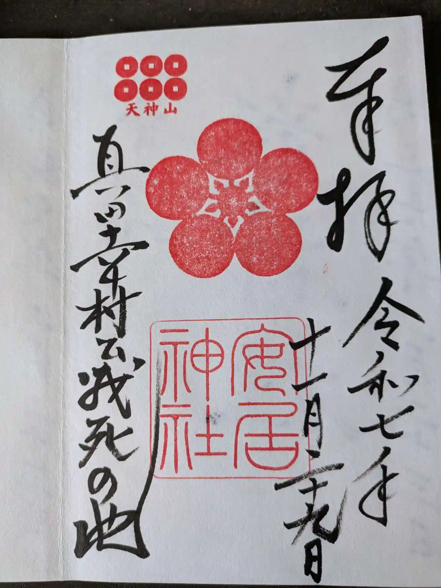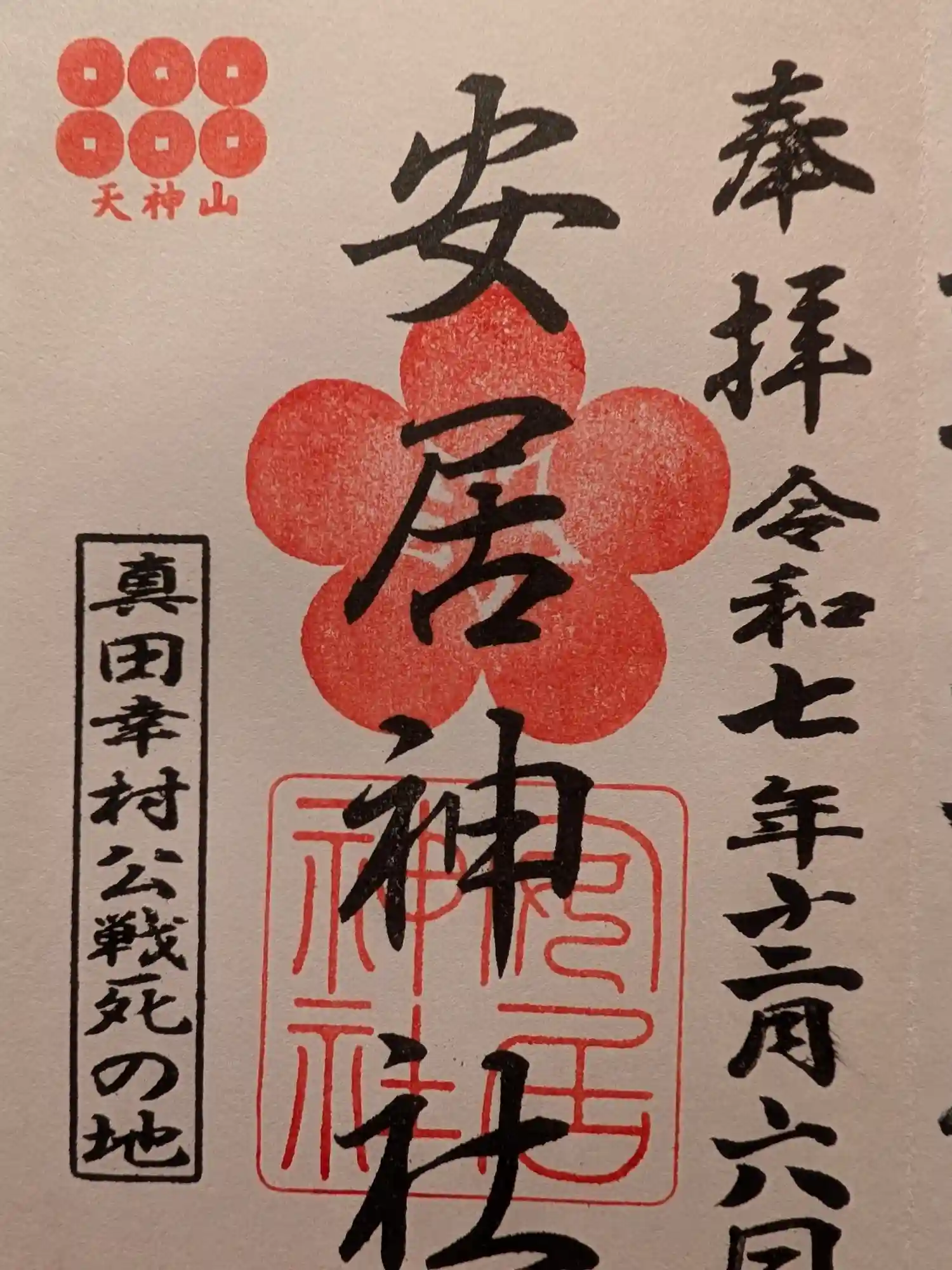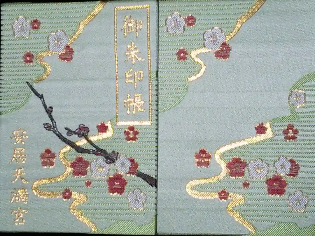 | 御朱印 | あり 真ん中に「安居天満宮」の墨書きに梅の神紋と神社印が重ねられています。