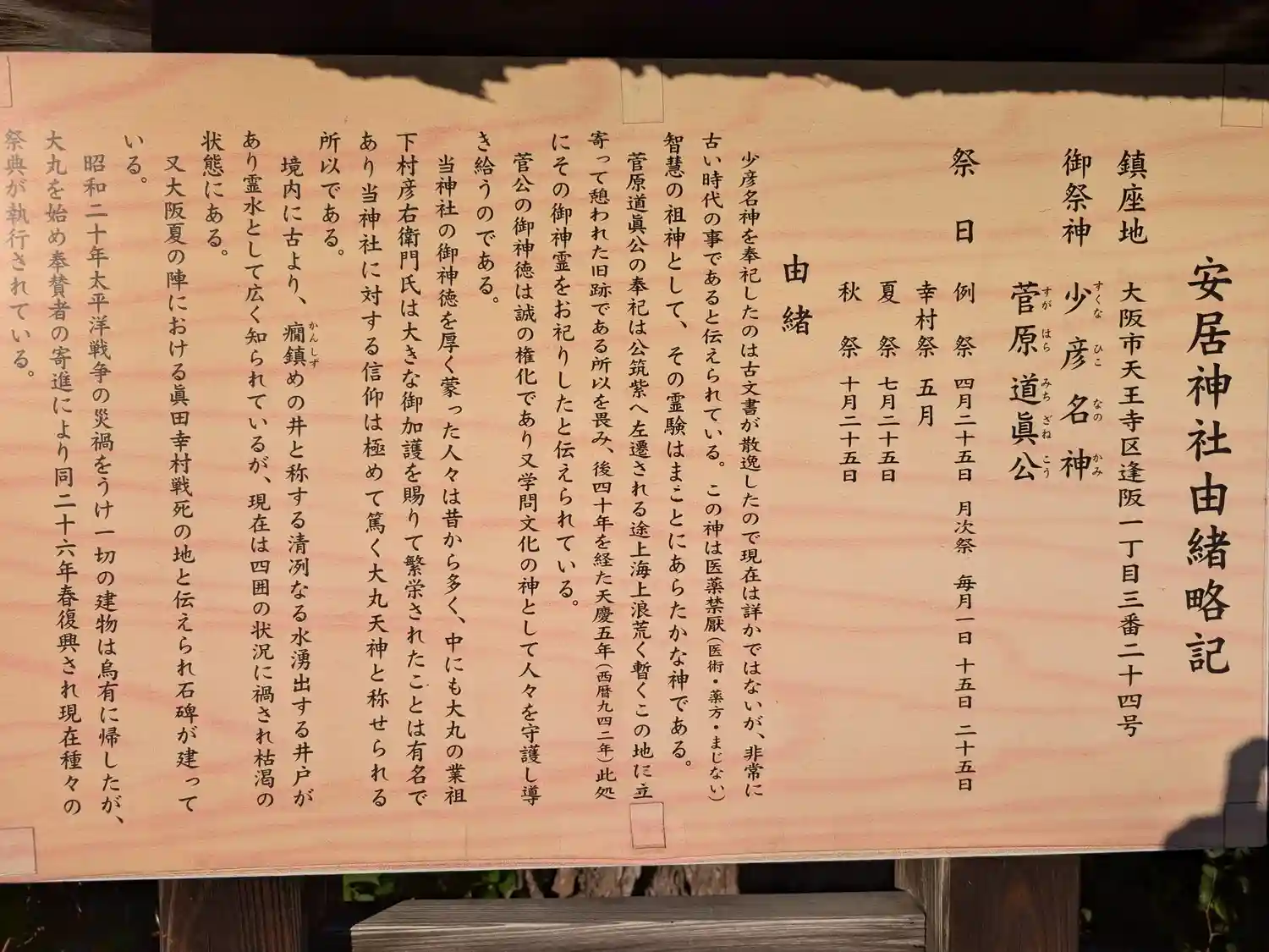 | ご由緒 | 創建年は不詳であるが、聖徳太子が四天王寺を建てた推古天皇元年(593)年の頃であろうと伝えられる。菅原道真公が昌泰4年(901)、大宰府に左遷された折、河内の道明寺天満宮にいた伯母・覚寿尼を訪ね、その道中に四天王寺を参拝し、同社で安居(休憩)した。社名はこれに由来する説と、四天王寺の僧侶が修行する場を「安居」ということに由来する説とがある。