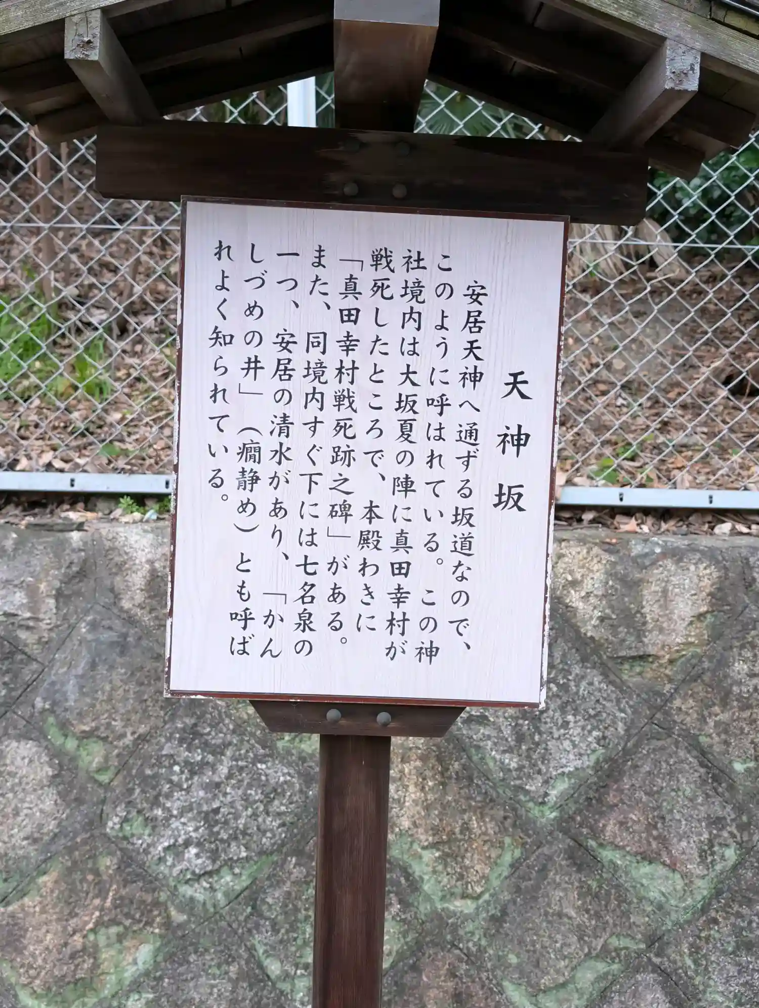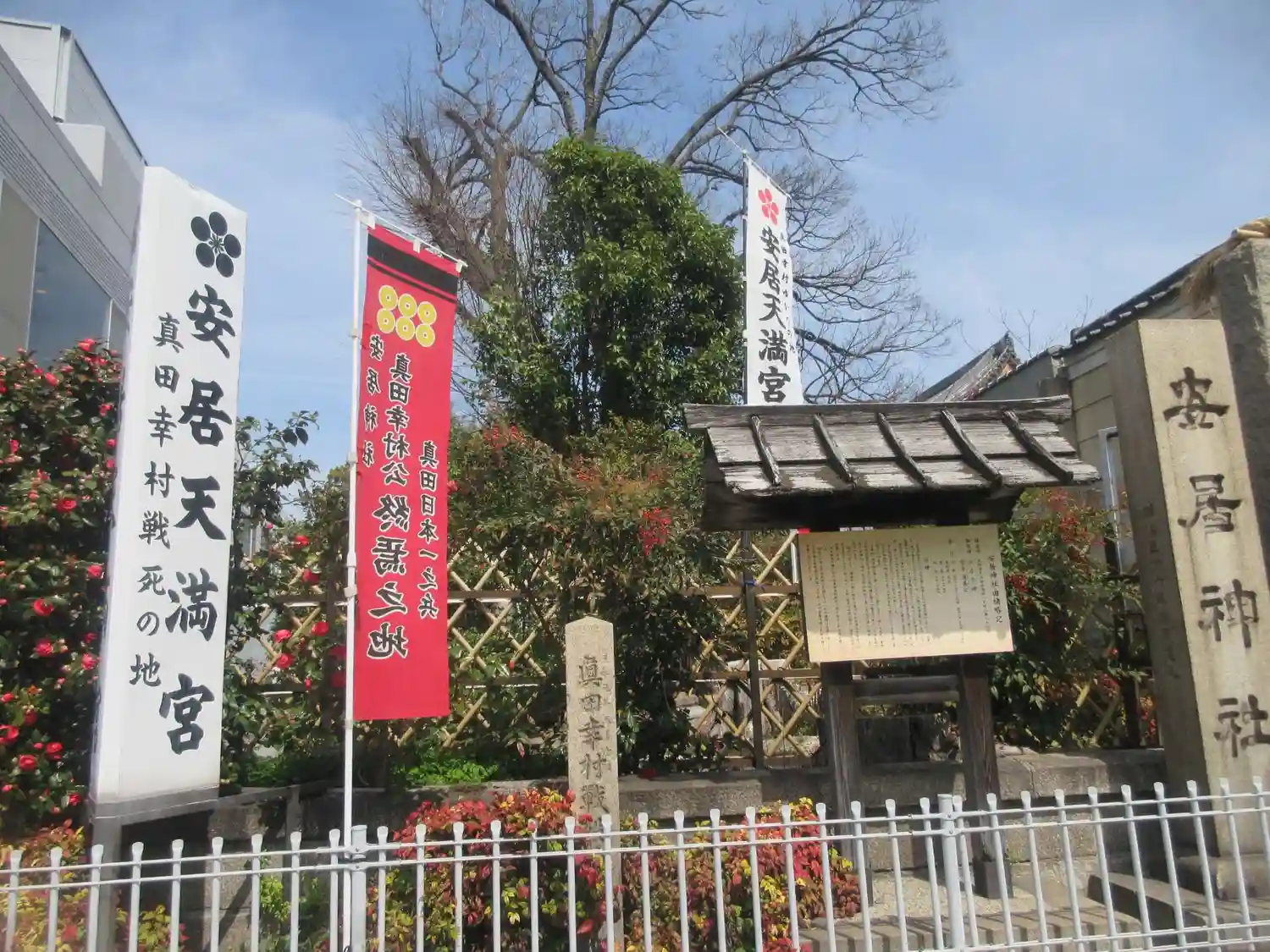 拝殿の右手には「真田幸村戦死の碑」と幸村の銅像が建つ。元和元年(1615)大坂夏の陣で天王寺茶臼山に着陣した幸村は徳川軍本陣に迫る活躍を見せるも力尽き、安居神社まで引き上げる。境内で休息していたところを越前藩主・松平忠直の家臣によって討たれたとされる。享年49歳。