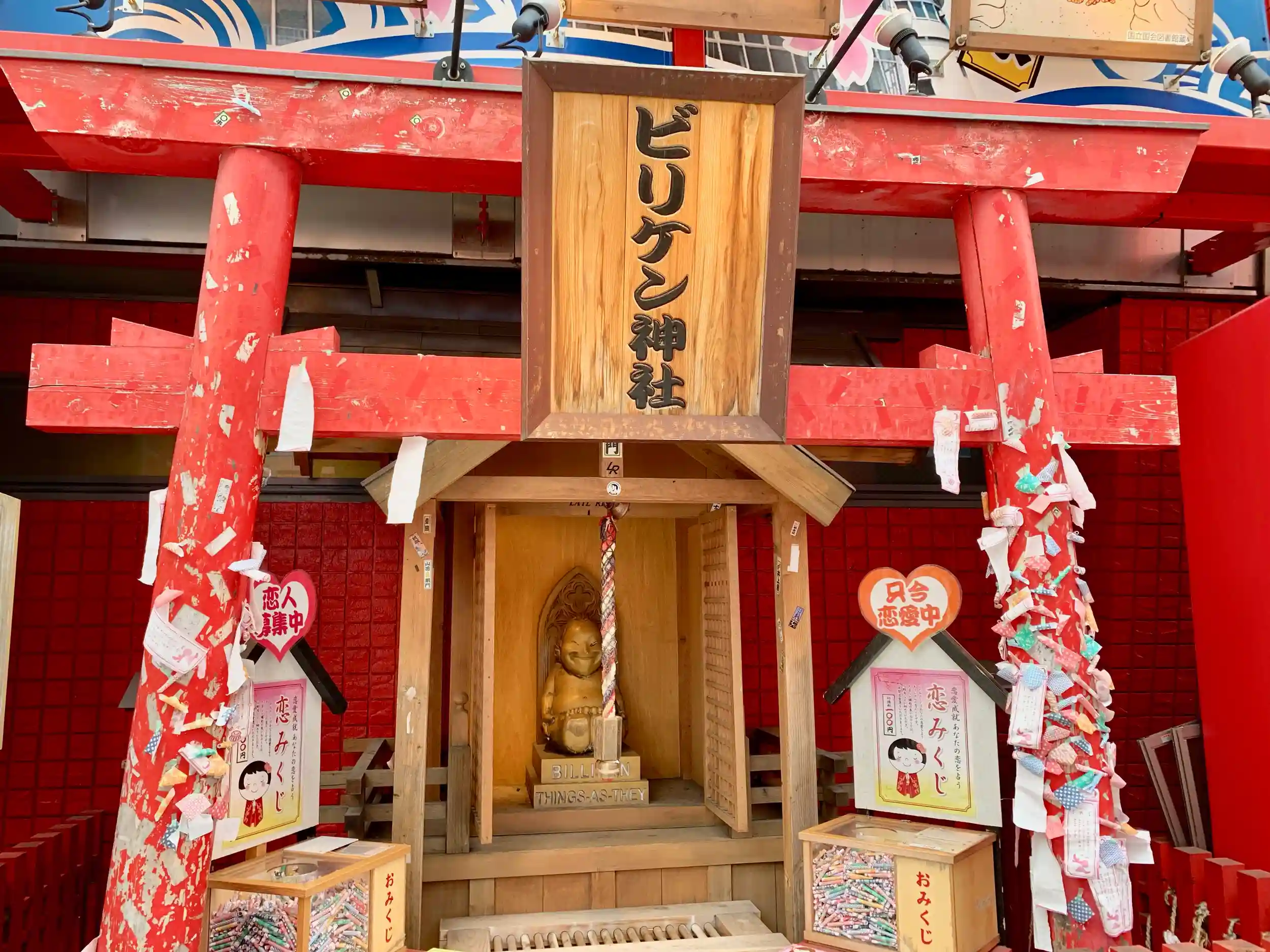 朱色の鳥居に扁額に「ビリケン神社」で、拝殿、中央に可愛いビリケンさん。