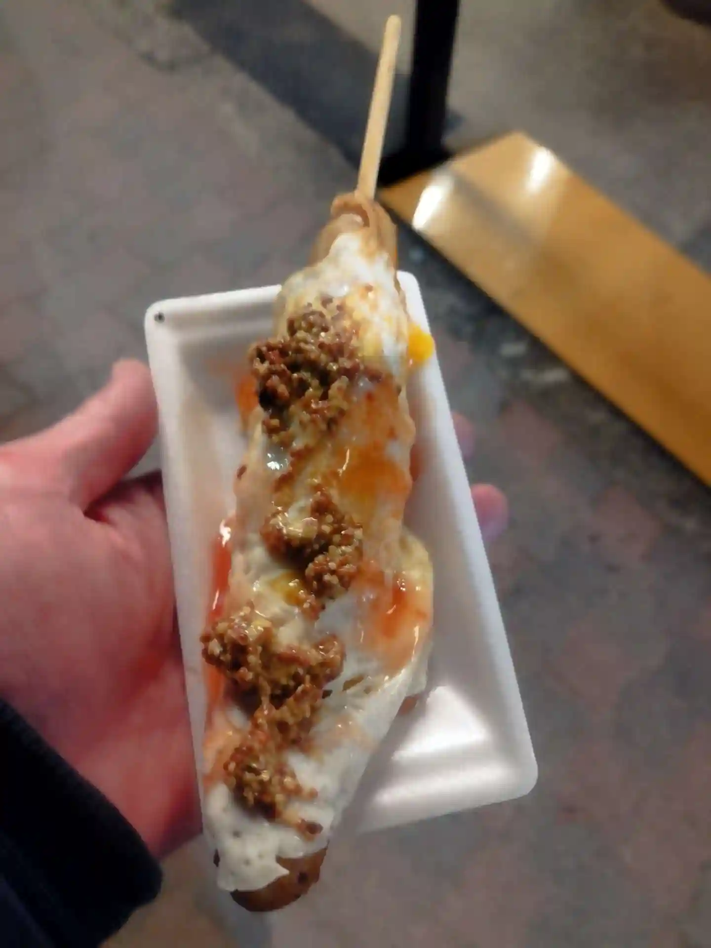 参拝後に出店でチーズ巻きフランクフルトを頂きました。(どちらかと言うとタマゴ巻きフランクフルトやったなチーズ少なめw)