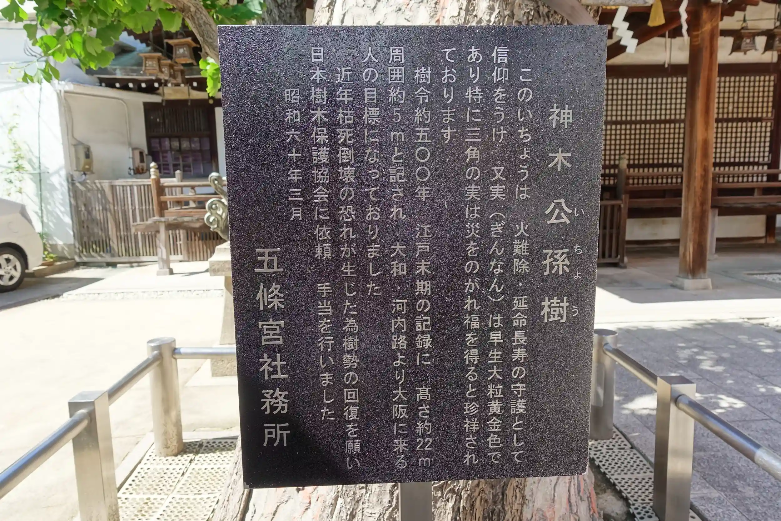 創始不明、社殿によれば難波京の五條筋に当たる場所で、第30代敏達天皇が皇太子時代に居住した邸宅跡で、四天王寺建立の折に医道の祖神である五条大神・少彦名命を祀る。