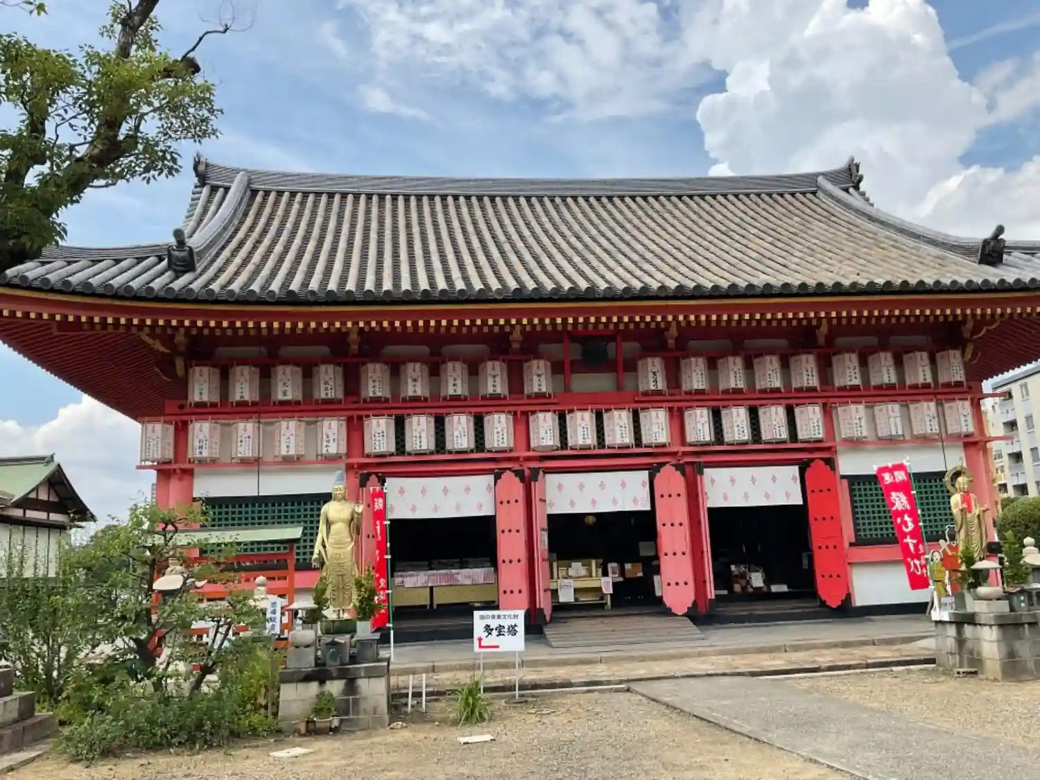 勝鬘院さんの多宝塔です。 推古天皇元年(593年)聖徳太子の創建 その後、織田信長の金堂と共に焼失 慶長二年(1597年)豊臣秀吉が再建 明治四十二年国宝建造物に指定 ご本尊は大日大勝金剛尊は微笑を浮かべて、ひっそりと白色の蓮華座の上に座っているのは、十二臂(12本の腕)をそなえ持つ、世にも珍しい大日如来さまです。大日大勝金剛尊単体では大阪市の有形文化財に指定されています。 毎年愛染まつり初日(6月30日)には、総本山四天王寺の管長猊下と高徳僧侶たちによって夏越しの祓えの大法要が多宝塔を囲んで盛大に行われます。また 、愛染まつり(6月30日~7月2日)の期間中のみ、正面扉を開いて多宝塔の内部は秘仏が御開帳させます。 多宝塔の蛙股(かえるまた)には、十二支の彫刻が施されています。