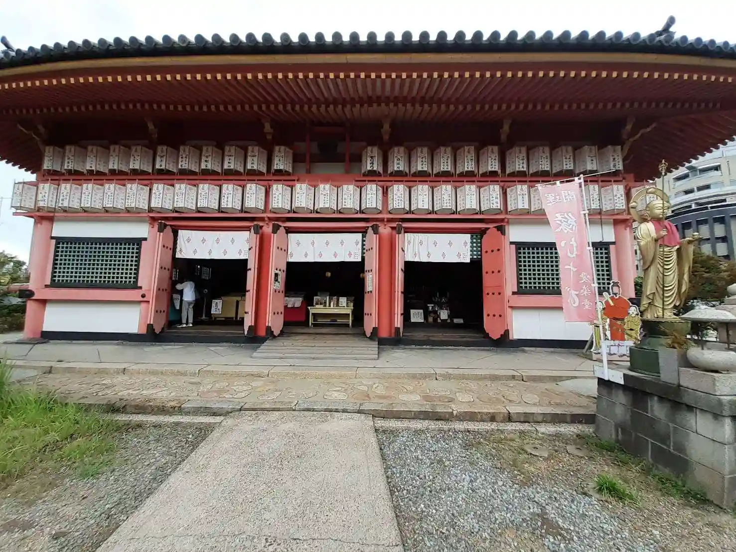勝鬘院さんの金堂です 推古天皇元年(593)聖徳太子によって創建 その後、織田信長の大阪石山寺攻めの際に多宝塔と共に焼失 徳川幕府二代目将軍・徳川秀忠の手によって再建         愛染明王(秘仏)が本尊として奉安されており、その左右には、薬師如来、勝鬘夫人(弁財天)、歓喜天、十一面観音などが祀られています。 金堂の前には左に慈母観音さん、右に慈父地蔵さんがいらっしゃいます。 御本尊の愛染明王は秘仏となっており、愛染明王の大縁日にあたる愛染まつり(6月30日~7月2日)とお正月の新春ご開帳(1月1日~1月7日)のみ御開帳されます。