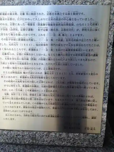 | ご由緒 | 大阪ミナミの繁華街より徒歩10分あまり、都会の真ん中にある萬福寺は、その立地から聖と俗の境目を示すかのように建っています。文禄3(1594)年に前田利家の弟にあたる前田次郎兵衛利信(僧開導)により開かれた萬福寺(まんぷくじ)の境内は花や樹木が豊かで、その風情は訪れた人の心に安らぎを与えます。都会の雑踏や喧騒とは一線を画したその静かな美しさは本堂の荘厳とは異なる趣で、しかし、確かに安寧の地を思わせます。目立たないが松尾芭蕉の句碑も建ち、ひっそりと山内を見守っています。また、幕末史を彩った新選組の旅宿(屯所)があった忠実もつとに有名です。長くこの街の移り変わりを眺めて来た萬福寺は、今日も落ち着いた佇まいでそこにあります。