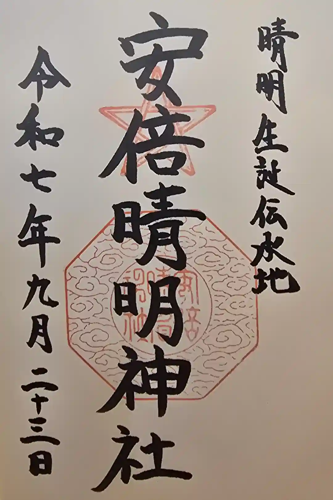 二重線で描かれた五芒星と神社印の上に「安倍晴明神社」の墨書きが書かれている、シンプルなデザインの御朱印です。 | |||